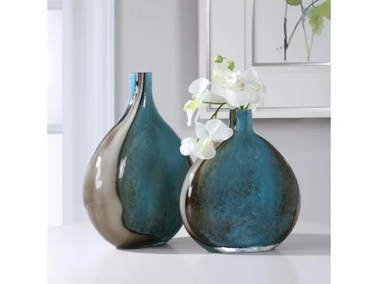 Set of two, art glass vases showcase deep cobalt blue and black hues.