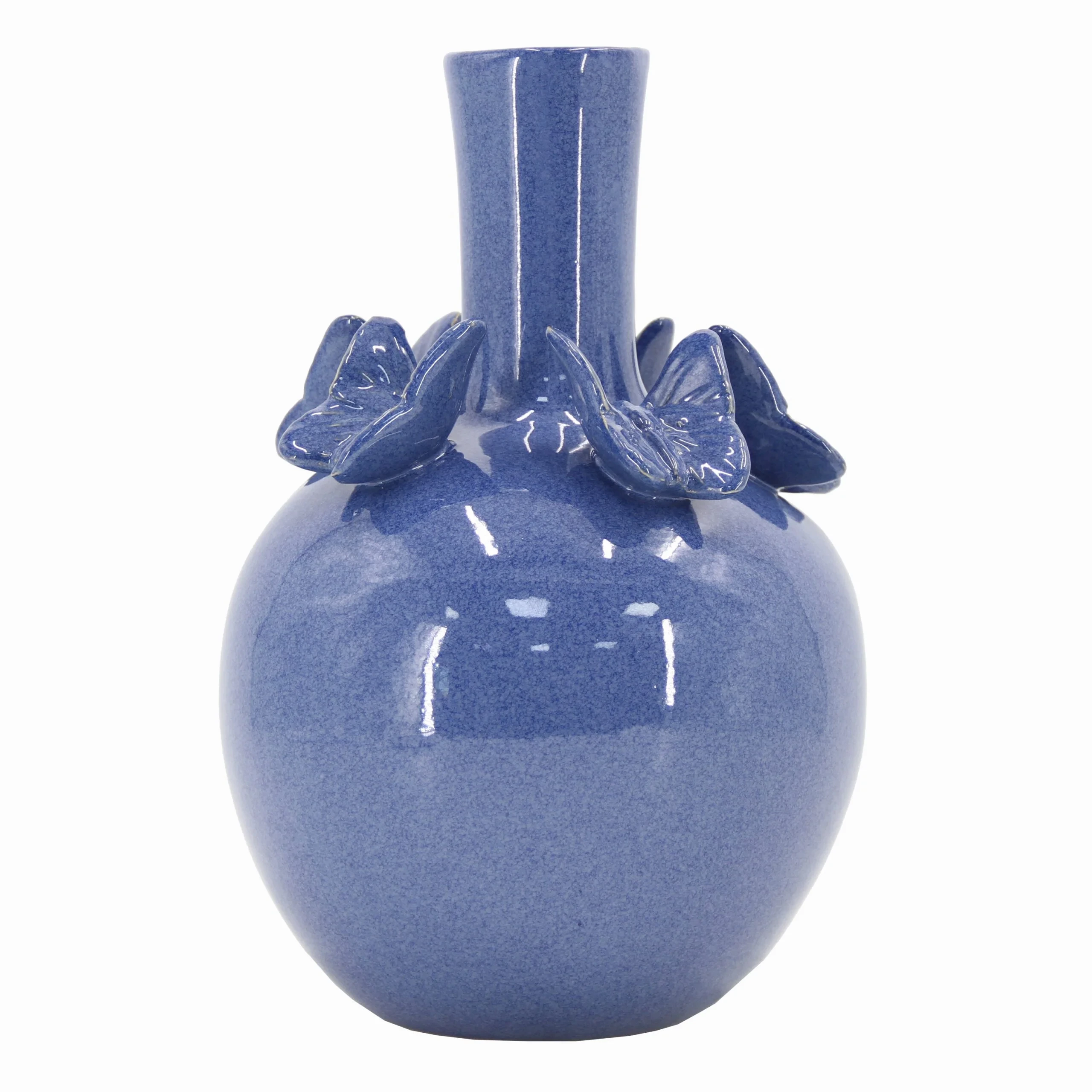 Handmade ceramic vase decorated with butterflies in a vintage blue color.