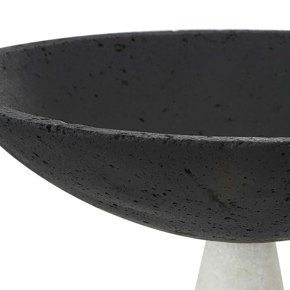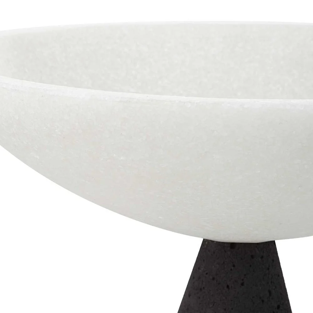 Set of two modern pedestal bowls are crafted from a striking black and white man-made stone that accurately replicating the look of Thassos marble.