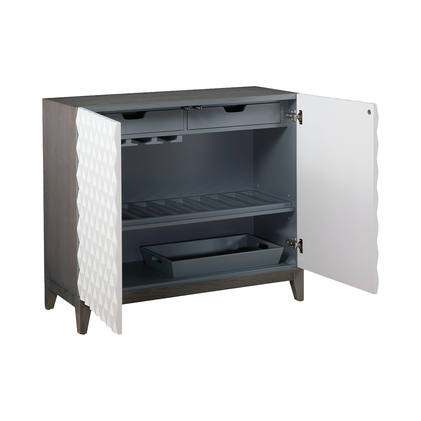 Two doors open up to one drawer with removable felt liner serving tray and stem ware storage along with one adjustable shelf with storage cleats on one side.