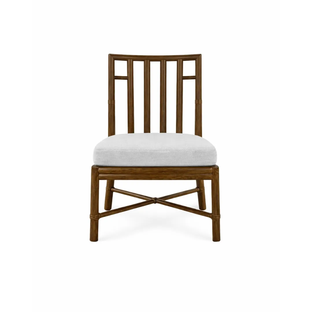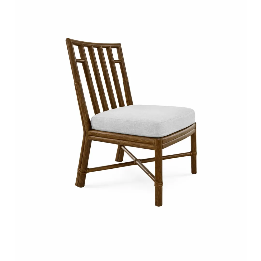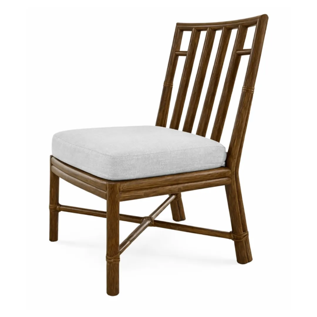 A refined chair crafted from natural rattan, featuring a warm wood tone and a soft grey upholstered cushion. Its timeless design and lightweight structure make it ideal for both dining and accent seating, blending comfort with understated elegance.