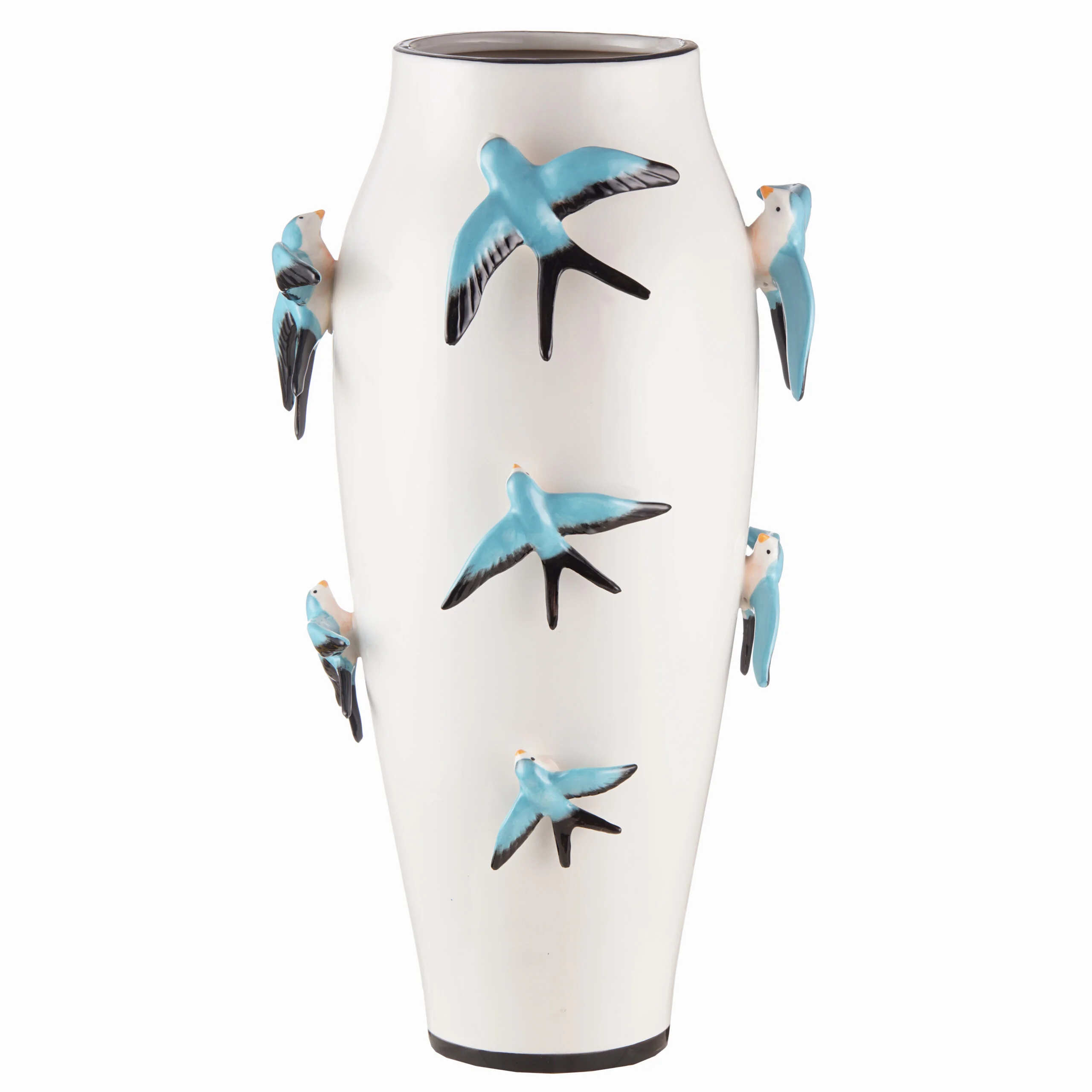 Unique narrow tall ceramic flower vase decorated with colored birds. The details and colors of this vase show that this vase is truly handmade.
