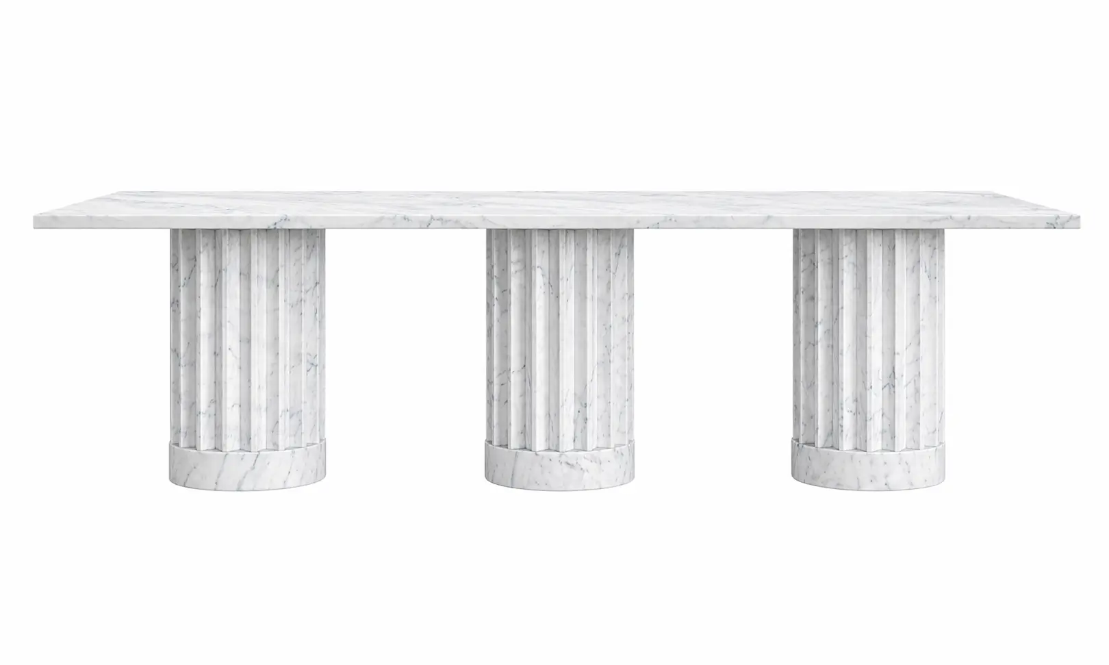 A refined marble dining table featuring a thick rectangular top with subtle grey veining, supported by three sculptural cylindrical bases with vertical fluting. Its clean lines and balanced proportions create a strong yet elegant presence, making it a statement piece within a modern minimalist space.