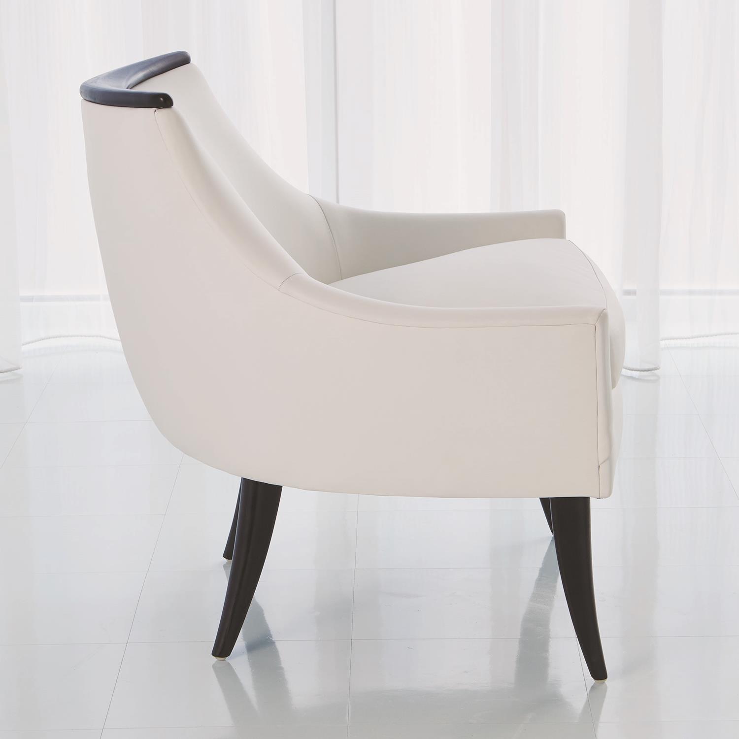 With its sleek lines, we revisit the classic beauty of the mid-century era in our white leather Boomerang Chair. The gently sloping curves of the arms lead to a soft v-shaped back detailed with rich ebony finished wood trim. Legs in the same ebony finish flare slightly, giving the chair interest from head to toe.