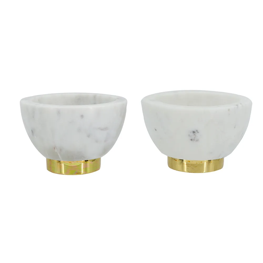 Accent your table with the elegant Britton set of two marble bowls on metal pedestals. Crafted of beautiful white marble atop metallic copper finished steel, these bowls are a perfect way to serve in style.