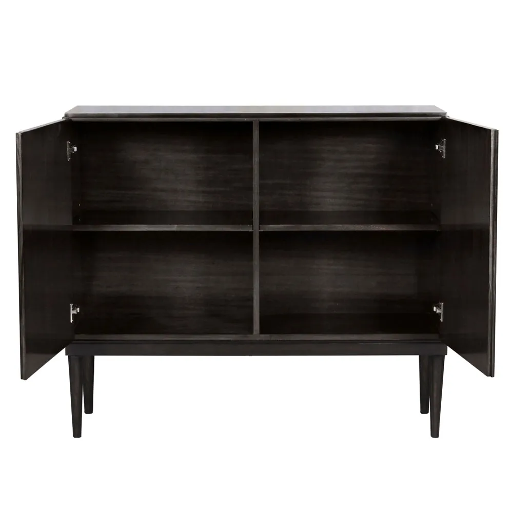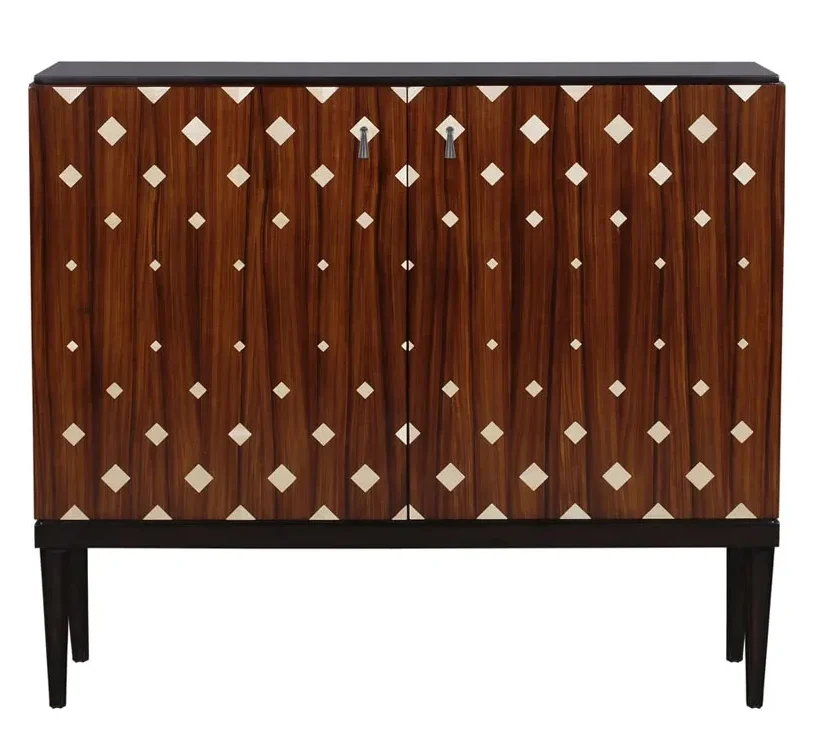 Cabinet Bloques is mahogany cabinet with two doors and two shelves. The front has eye catching maple inlay on rosewood veneer.