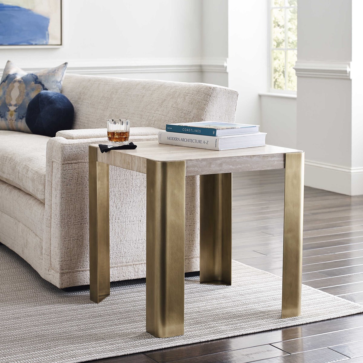 The Caress Table showcases an impressive unfilled, honed beige travertine top, contrasting with four light antique brass metal legs that caress and wrap the table’s rounded corners. The light simplicity of the table’s design belies its substantial and stalwart quality, providing maximum function.