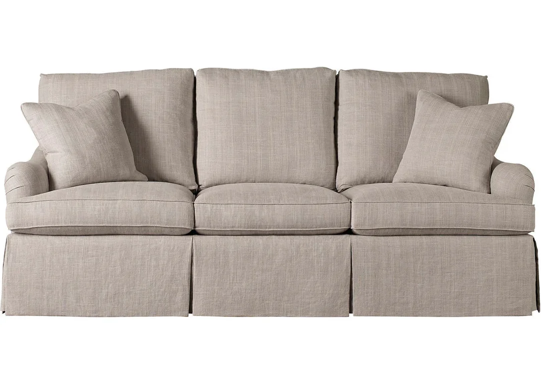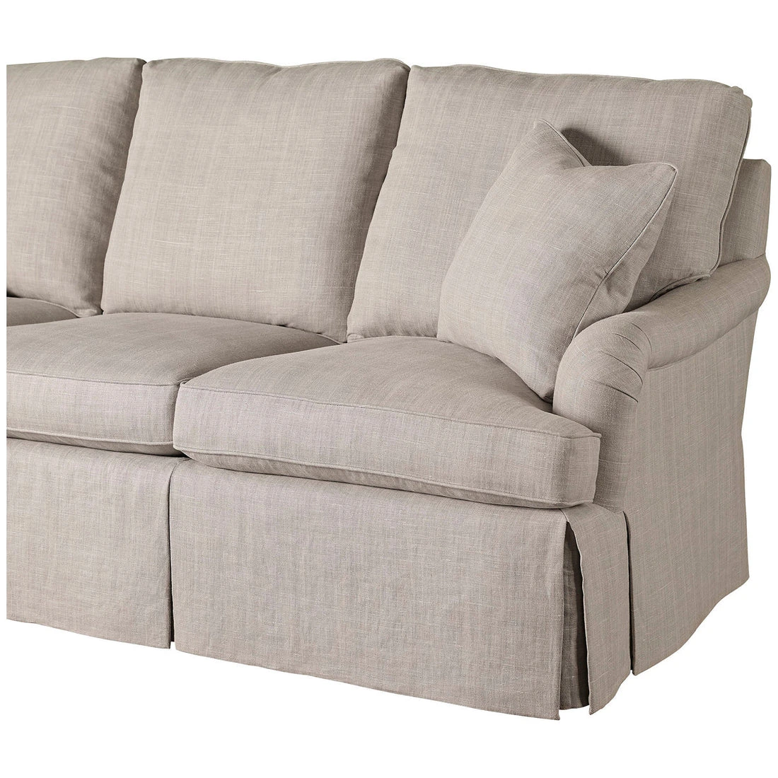 This is a very English sofa with an exaggerated saddle arm and a relaxed dressmaker skirt. A loose box cushion back adds crispness over three seat cushions. Michael S Smith views upholstery as something that works, moves, and lasts.