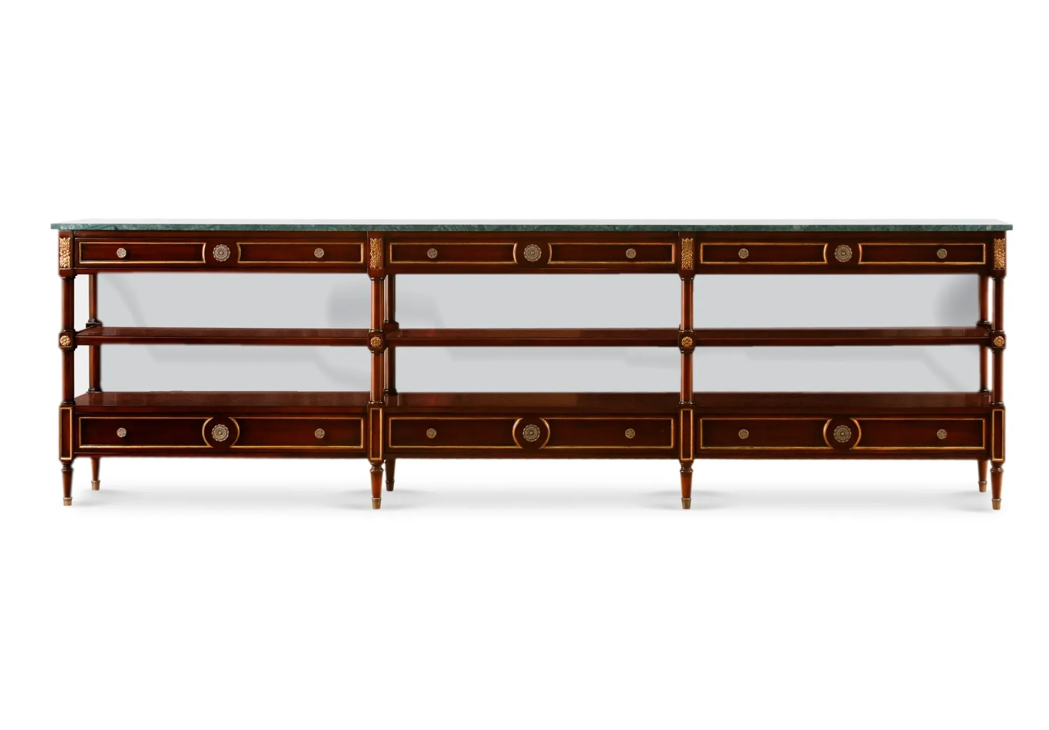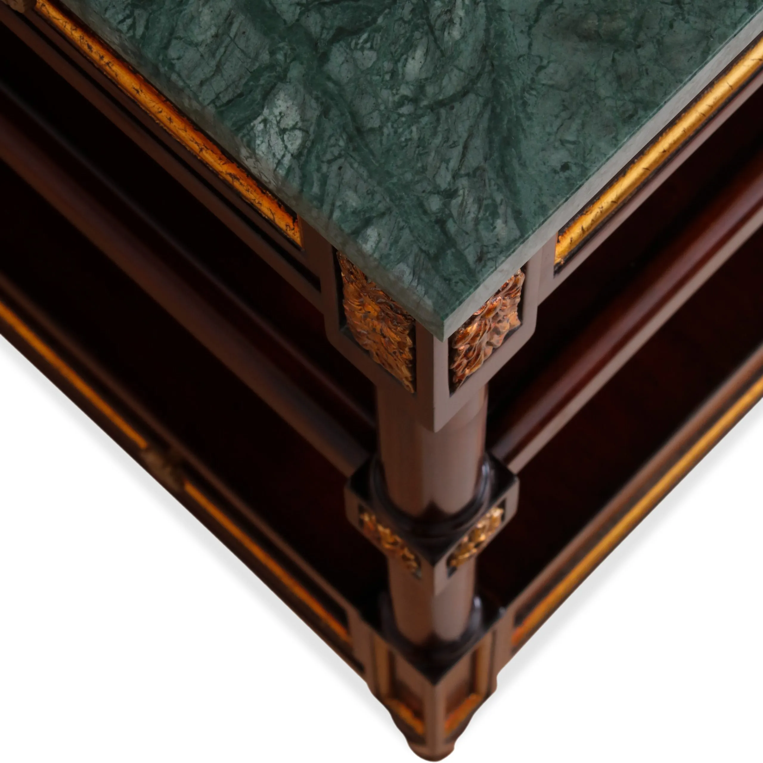 Featuring a luxurious green marble top, this table is adorned with hand-carved gilding in a stunning gilded accent, all meticulously crafted from high-quality mahogany wood.