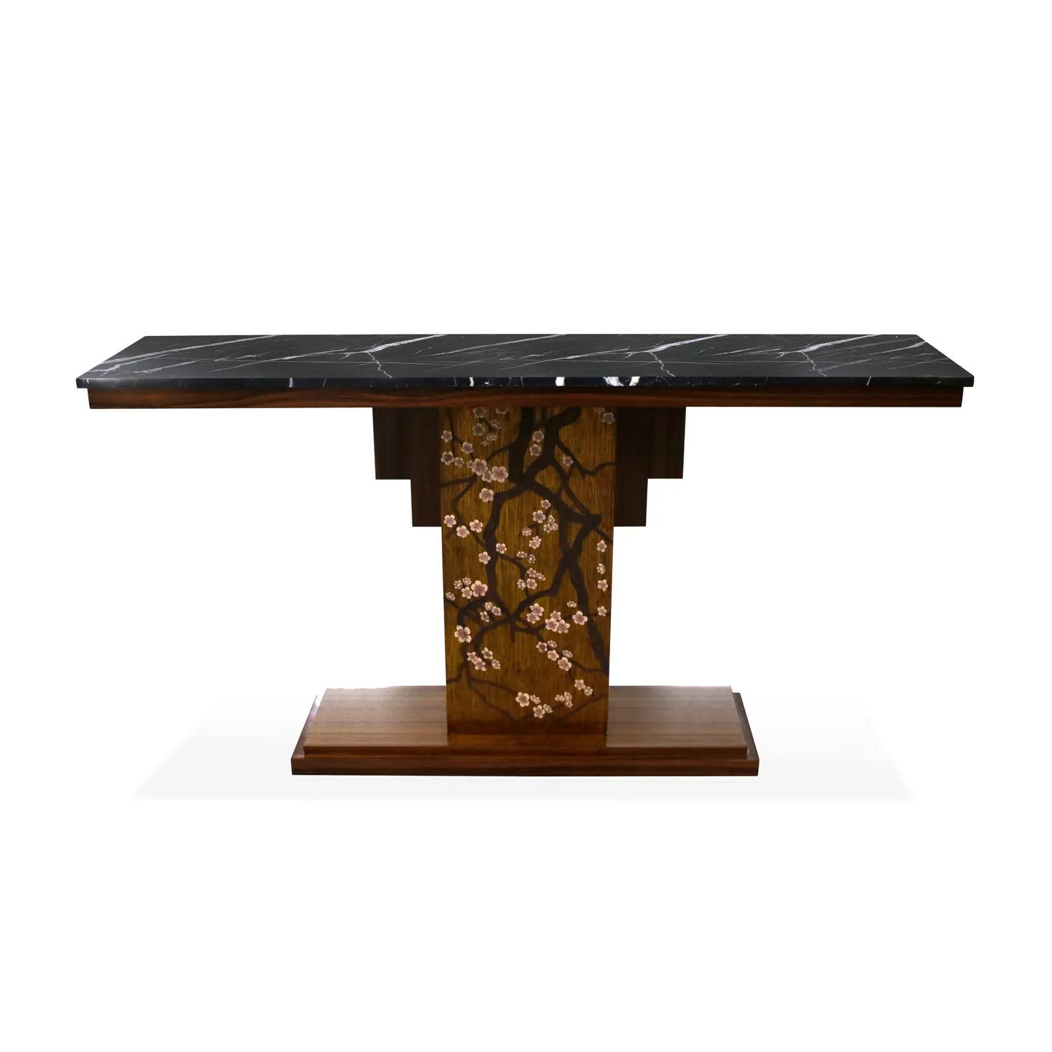 A stunning blend of timeless elegance and contemporary design with a nod to nature?s delicate beauty through a captivating cherry blossom mosaic accent adorning its wooden base.