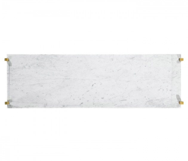 Cabinet is constructed of hardwood with an ebonized finish. Top features Calacatta marble from northern Tuscany. Doors feature brass with a satin finish. Interior includes one drawer and one adjustable shelf in the center. One adjustable shelf behind the remaining doors.