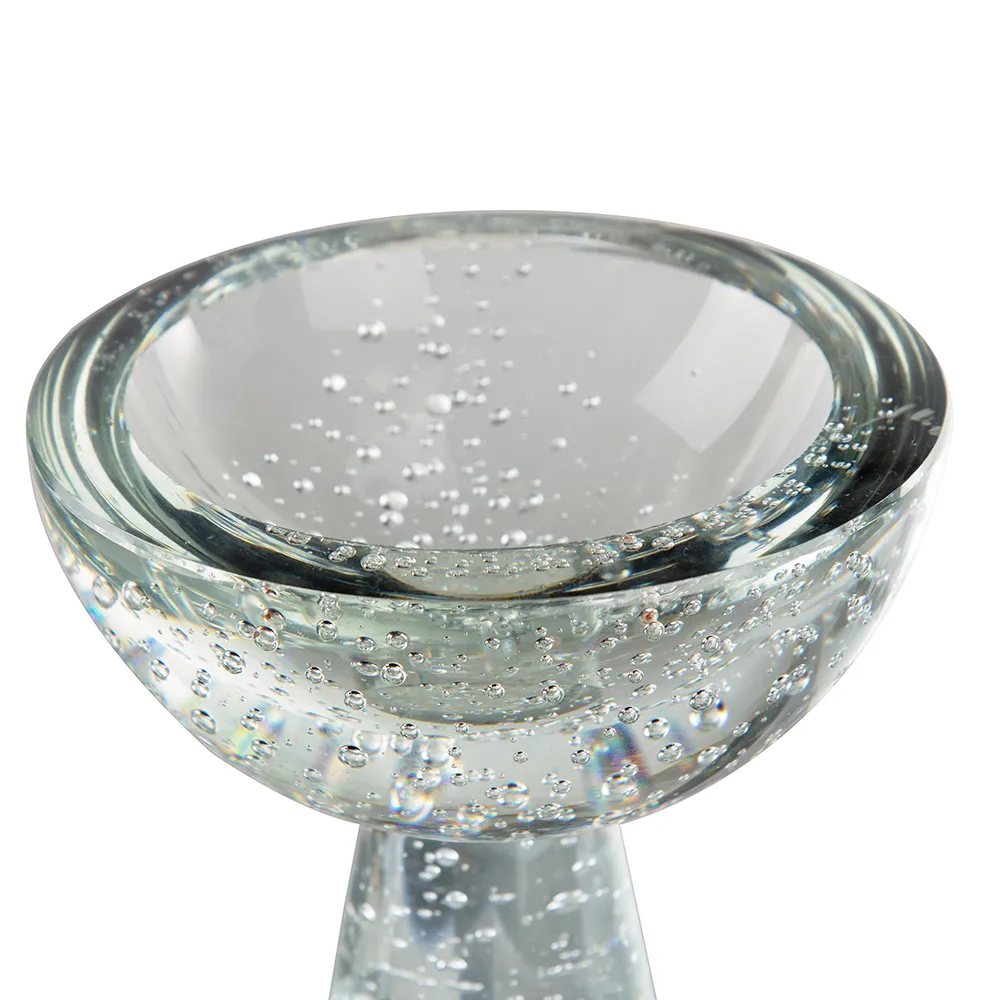 Decorate your living or dining room with this elegant and luxurious glass pedestal bowl. Featuring a unique contemporary shape in clear bubble glass, this decorative piece will add a special touch to your room.