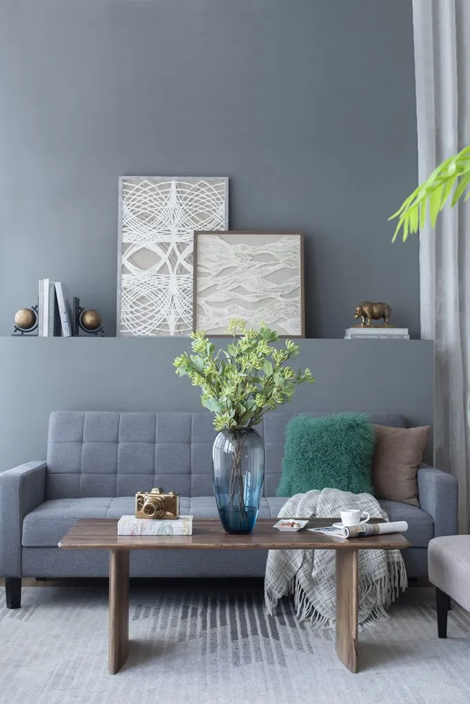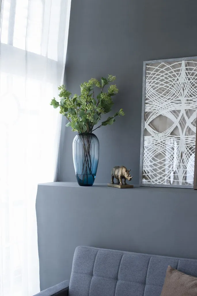 Elegant decorative jar crafted from translucent glass, featuring a soft gradient from smoky grey to deep blue. Its smooth, rounded silhouette adds a refined and contemporary touch, making it perfect as a standalone accent or styled with fresh greenery for a sophisticated interior look.