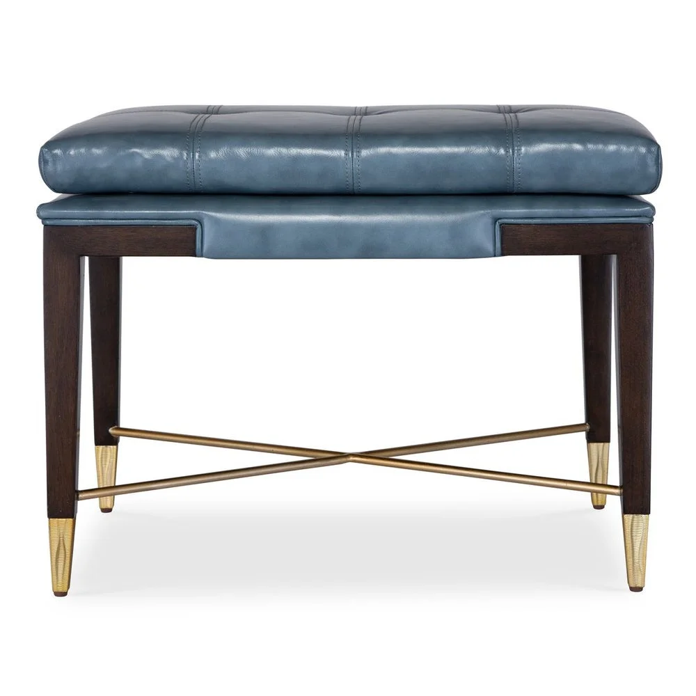 Seductive tapered legs are capped with dazzling gold finished metal feet. A removable tufted blue top grain leather seat cushion provides maximum comfort. Made of rich walnut veneer, the High Heel Bench will provide beauty and function in any room it inhabits.