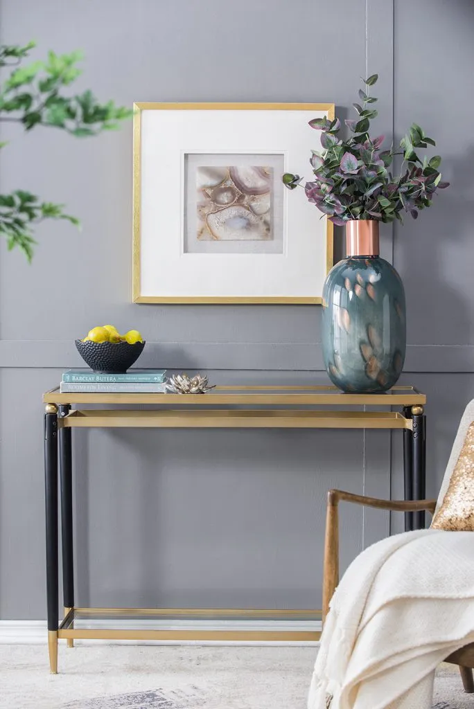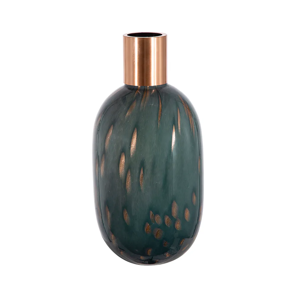The Kata Glass Vase unveils eye catching details to your design. The copper colored trimming of the vases neck is simple allowing the soft swirled design of the glass to accentuated the handcrafted caves seen throughout the vase. Compatible in any transitional design, the blue and copped color scheme of the vase fits perfectly to accentuate and side table.