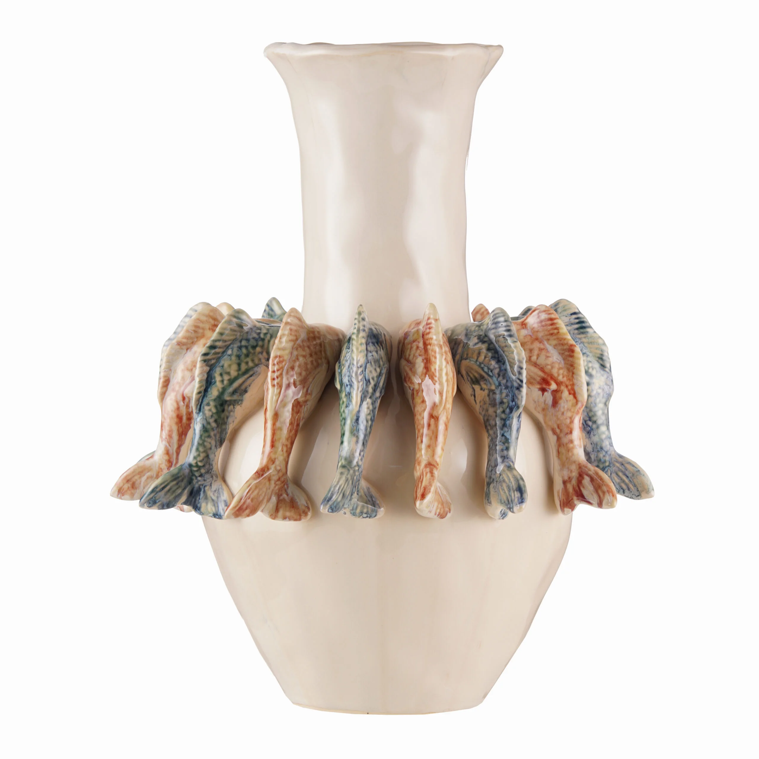 Tall large ceramic spout vase decorated with fish in different natural colorful shades. The details and colors of this vase show that this vase is truly handmade.