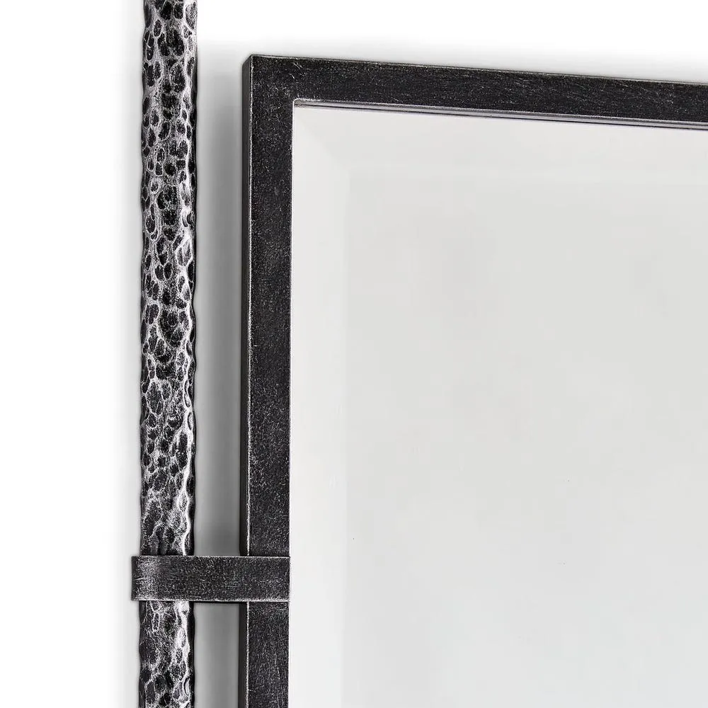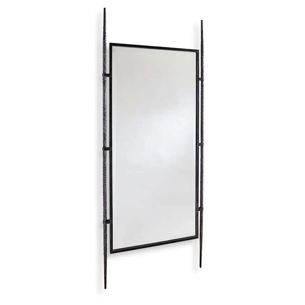 The center steel frame is suspended between two hand-forged textured legs. The mirror has a generous 1.25″ bevel. Can be hung or leaned against a wall using the non-tip kit provided.