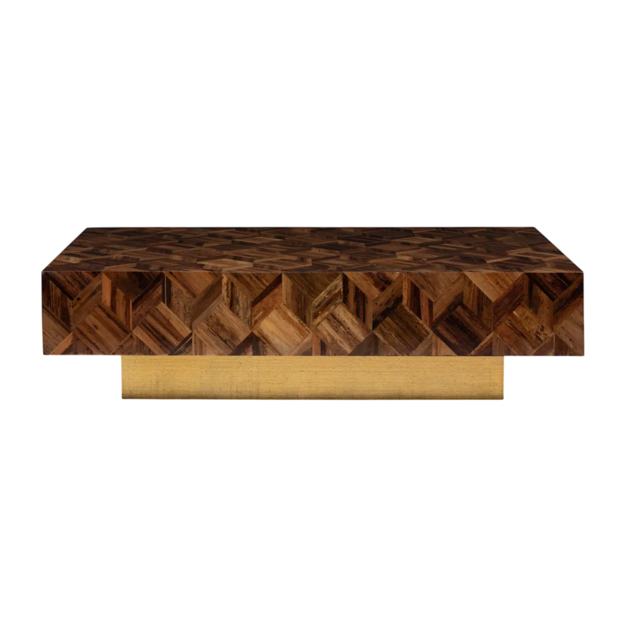 Natural banana bark, used for the herringbone marquetry of this coffee table’s thick, rectangular top, is paired with a painted-gold raffia base.