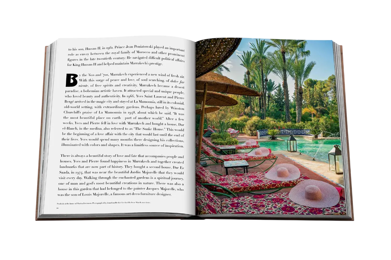 Marrakech overflows with culture and has been inspiring visitors for decades. From Yves Saint Laurent to Talitha Getty, Winston Churchill to Mick Jagger, Marrakech has attracted great icons inspired by its eternal spirit as well as its sweet, beautiful life. Yves Saint Laurent?s intimate relationship to this city lead to the opening of a museum dedicated to his legendary work. The annual Marrakech International Film Festival draws a prominent crowd. Museums abound, exhibiting Moroccan arts, photography, carpets, and the Andalusian design aesthetic that permeates the city?s architecture. La Mamounia hotel, opened in 1923, offers a storied history, which includes hosting guests such as Winston Churchill. Vanessa Branson?s El Fenn is a collection of traditional riads that form a stunning boutique hotel. There are countless ways to be immersed in the culture of Marrakech, but perhaps the best place to start is with a simple glass of mint tea.