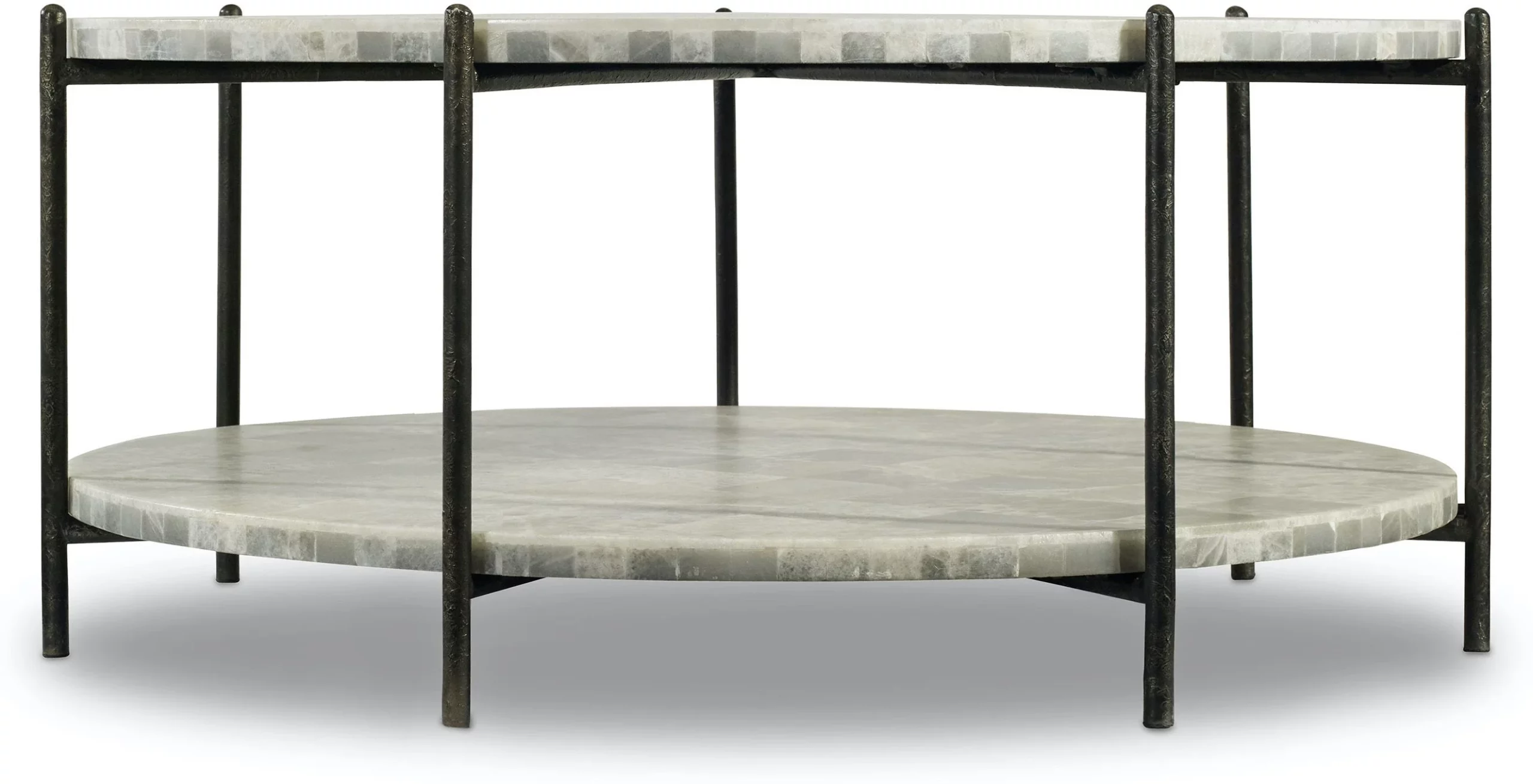 Industrial meets organic with the chic and couture Blythe Cocktail Table, combining an alluring round White Onyx top and bottom shelf with patterned veining with 7 slender metal legs for a versatile focal point piece that will add function and fashion to your living space. Come closer to Melange, and you will discover something unexpected, an eclectic blending of colors, textures and materials in a vibrant collection of one-of-a-kind artistic pieces.
