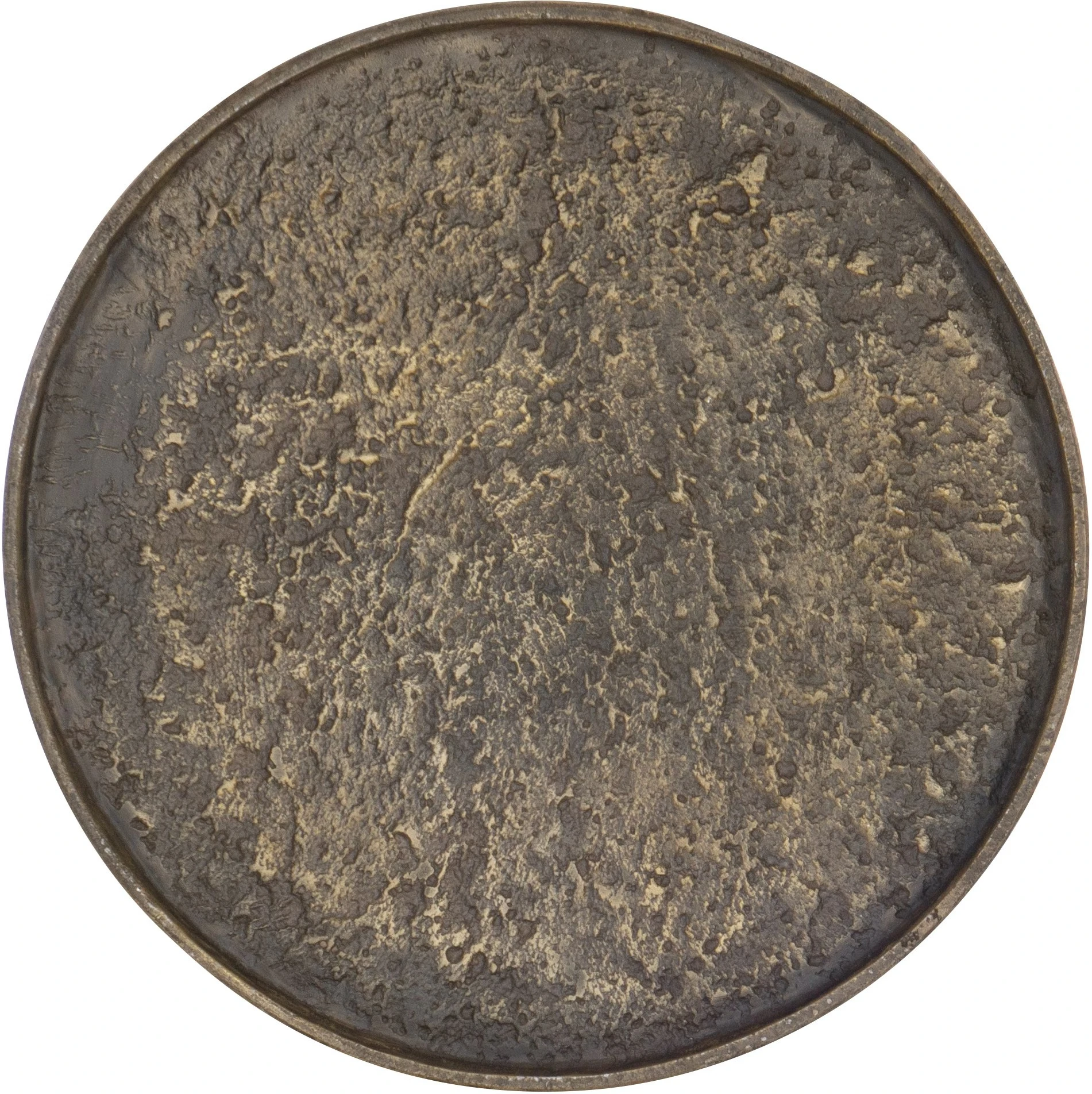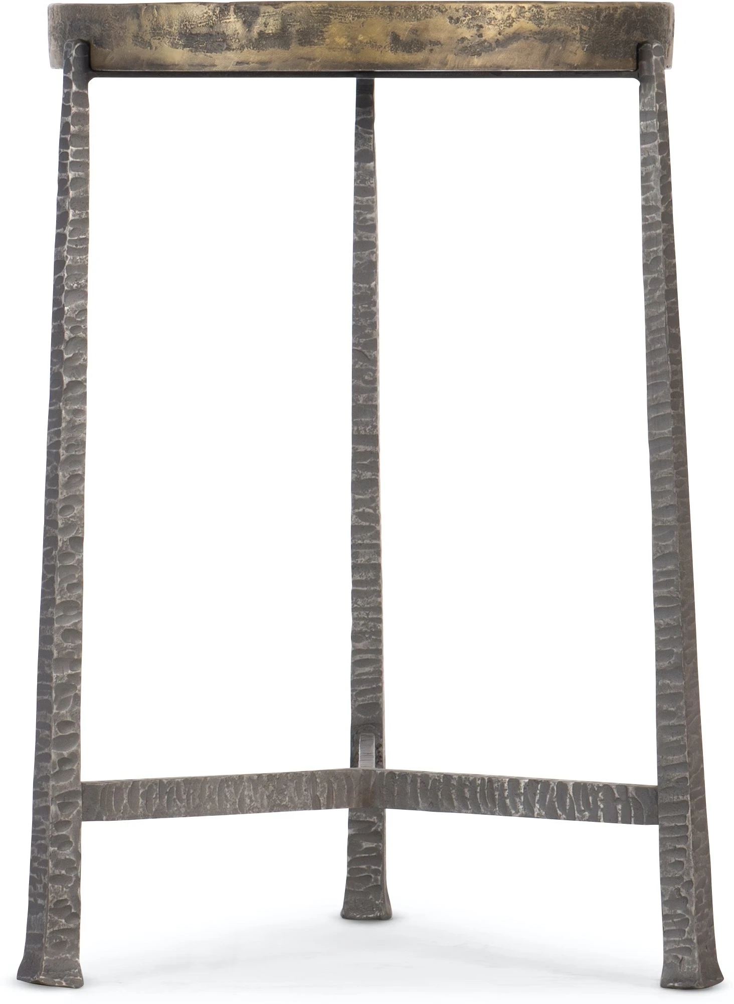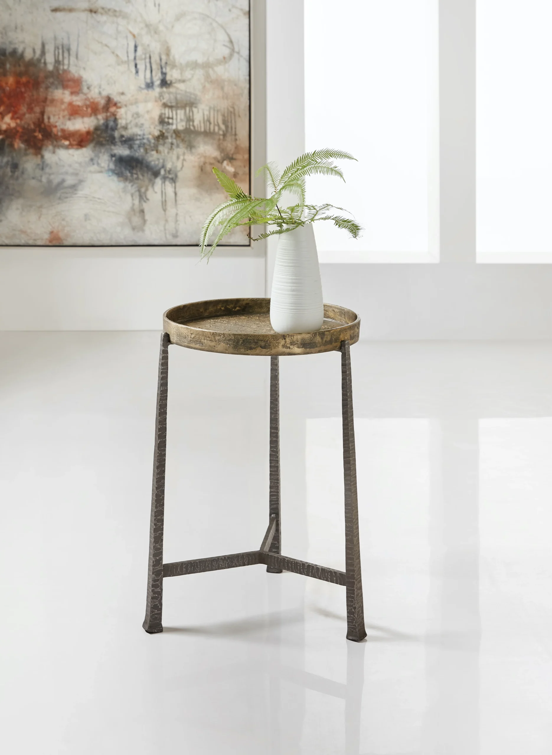 With a handcrafted appeal, the Funda Accent Table combines organic and industrial influences in a convenient, compact 16 ? by 16 ? round footprint. Crafted of hammered iron and cast aluminum in a distressed gold metal finish, the top sits on a metal base. Come closer to Melange, and you will discover something unexpected. An eclectic blending of colors, textures, and materials in a vibrant collection of one-of-a-kind artistic pieces, Melange is meant to inspire you and fuel an experience of self-discovery, inspiring a renaissance in your home. Each piece of Melange has its own story. The designs are versatile and timeless, easily transcending from one life stage to the next, from home to home and generation to generation.