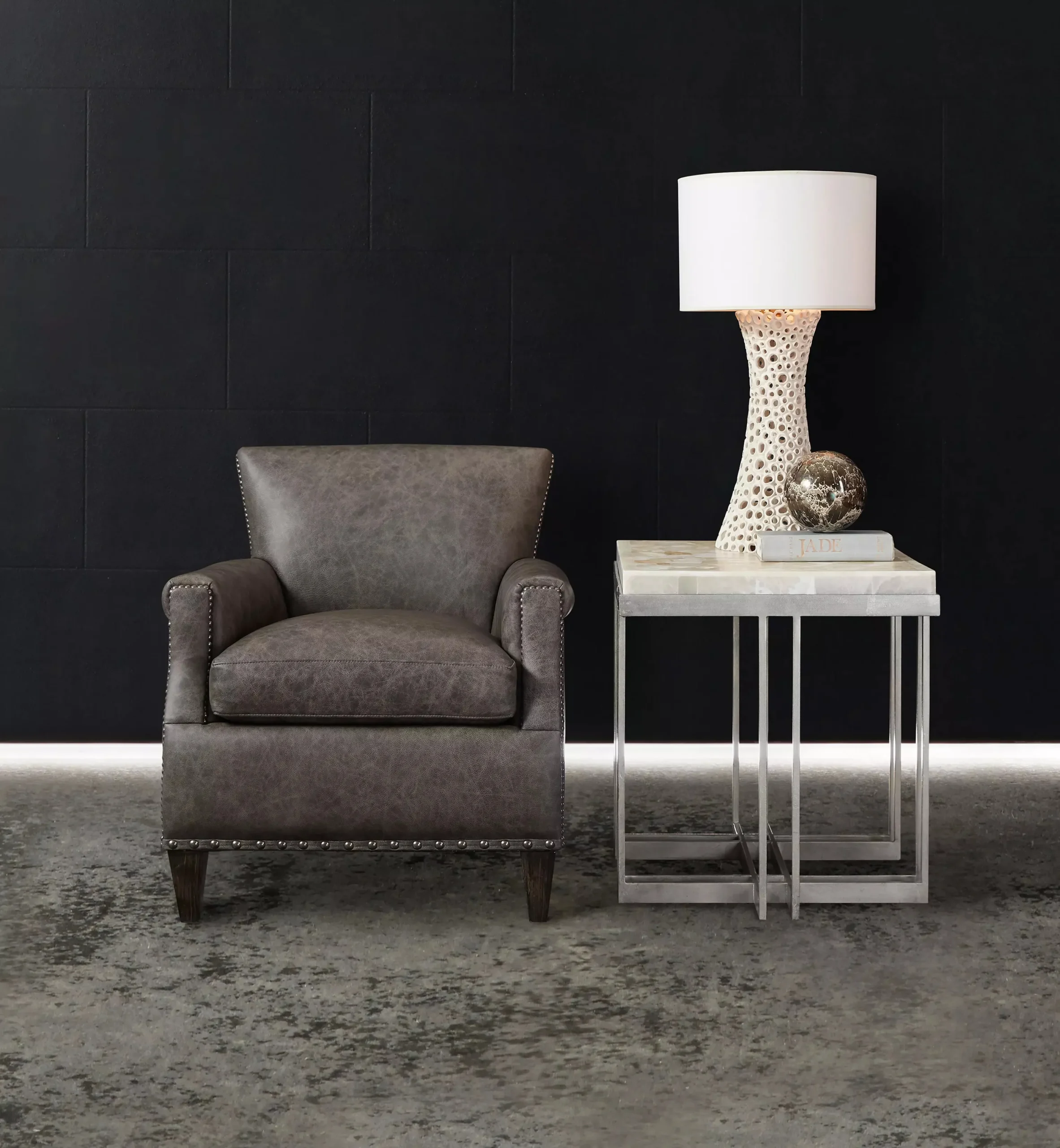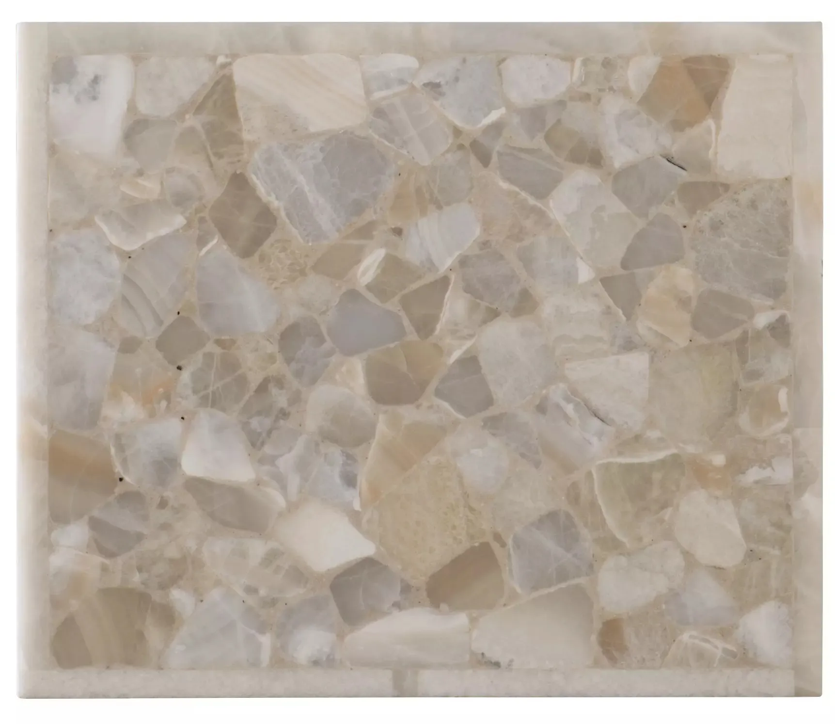 Chic and modern, the Mona end table exudes savvy style with an interlocking pewter-colored metal base and a tumbled white onyx tabletop.
