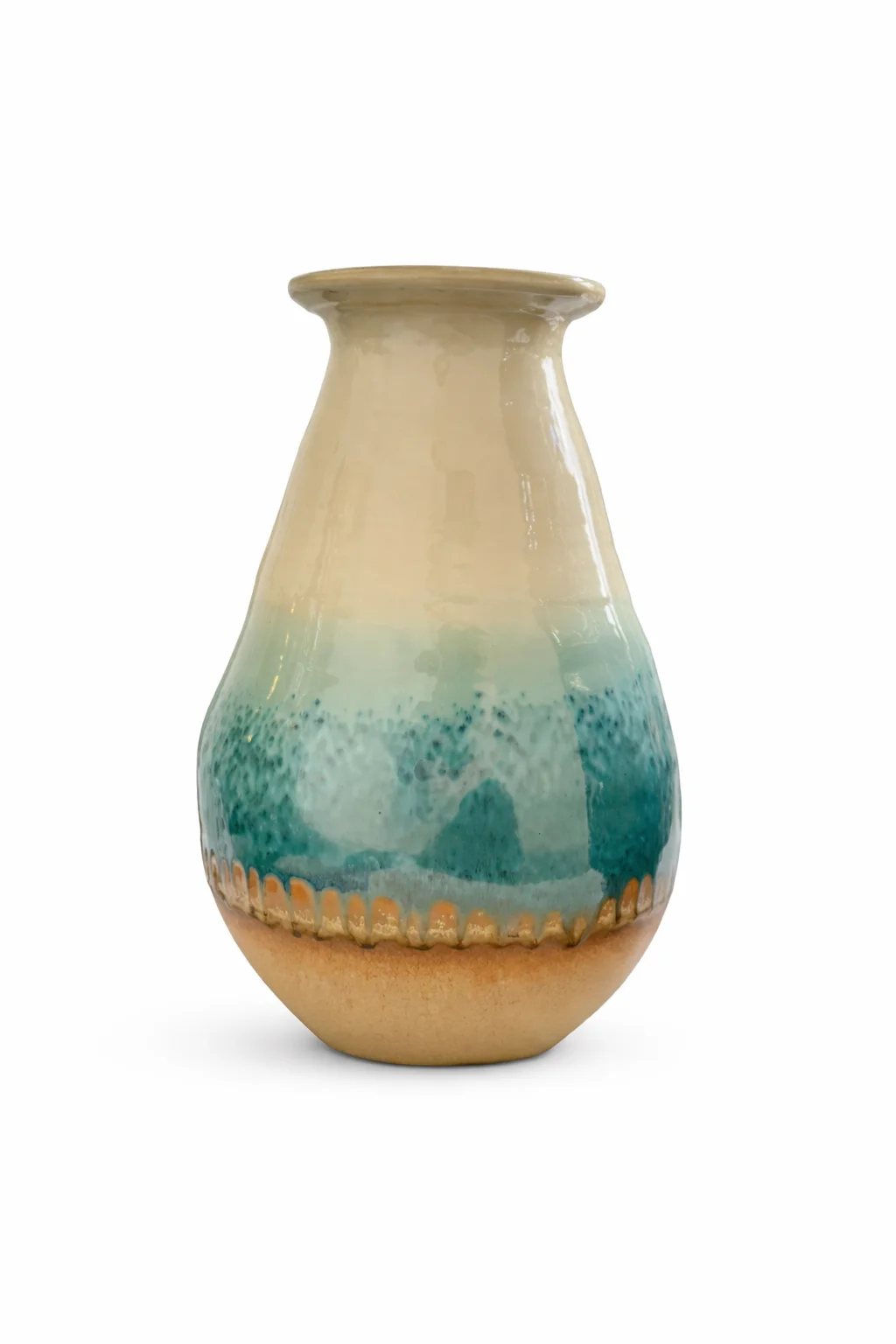 A beautifully crafted ceramic vase featuring a soft ombré glaze that transitions from warm neutral tones to rich aqua hues. Its organic texture and artisanal finish bring a natural, elegant touch to any interior setting.