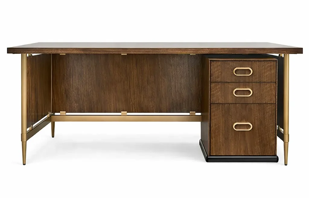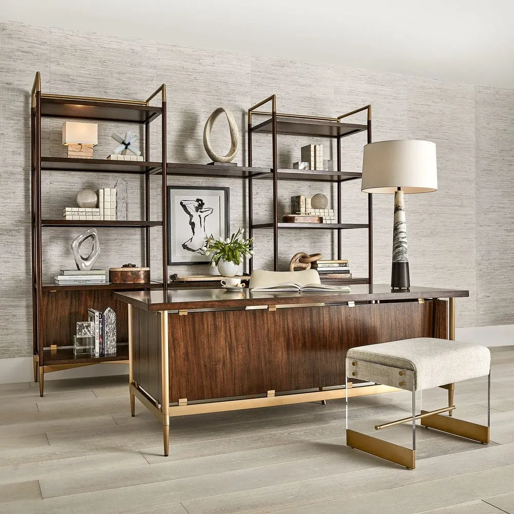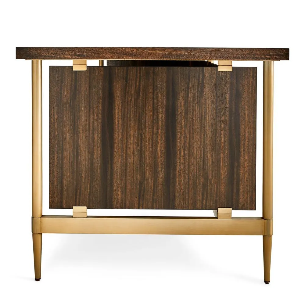 The Multiple Personality Collection is a creation of beauty, function and flexibility – designed to fit various spaces and lifestyles. Each piece can stand alone or be added together to create the perfect work space or display. Crafted of Trembesi wood (a native to Indonesia known for its dramatic variation in grain and color). A deep walnut stain creates richness and depth and is complemented with metal details in a gold powder-coat finish. The Writing Desk features three privacy sides suspended by gold-finished clamps.
