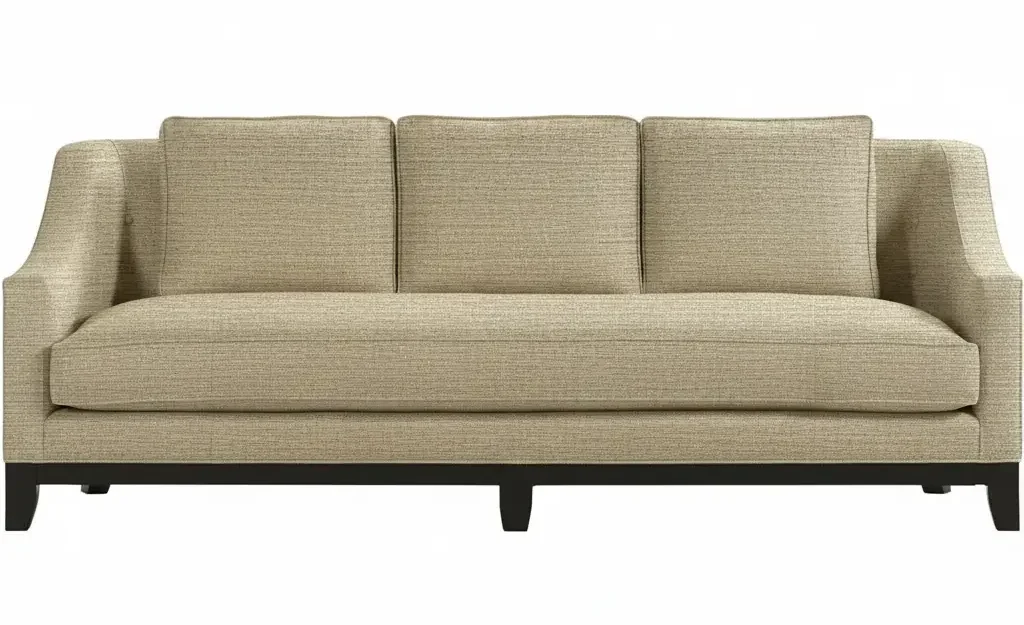 A slightly rounded loose three-cushion back with decorative buttons as punctuation. Bench seat. Flaring sinuous slope arms. Wood band over flaring tapered feet. Influenced by the new cafe culture of Vienna in the 1920s, this sofa is at once formidable and neatly tailored. With uncommon length and the absence of any space between the seats, the sofa version of this design was meant for entertainment. Wood banding offers an opportunity to frame or highlight with an optional finish.