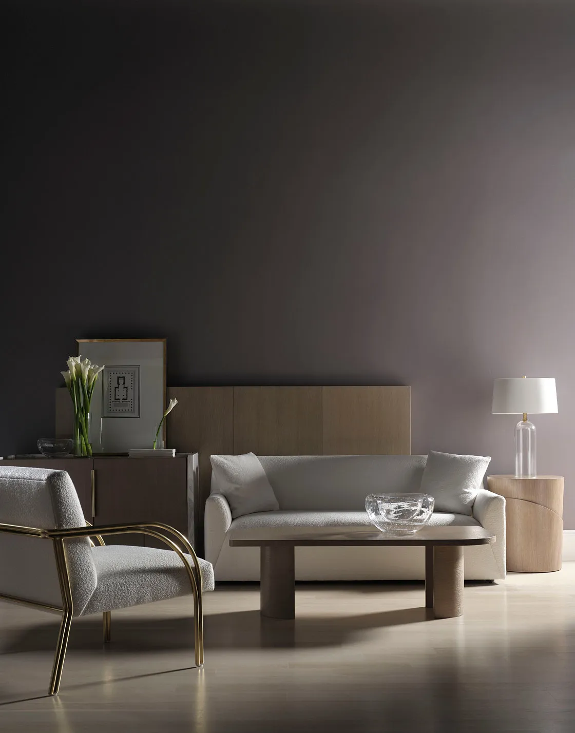 Playful and unexpected, the Nev Cocktail Table is a boldly creative piece that combines racetrack shaping and a more traditional straight edge. The table is made from quartered oak veneer with a diagonal veneer strip that spans its tabletop.