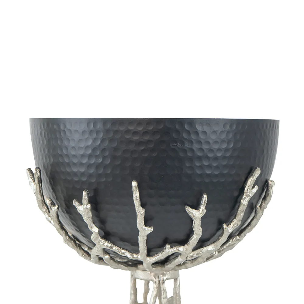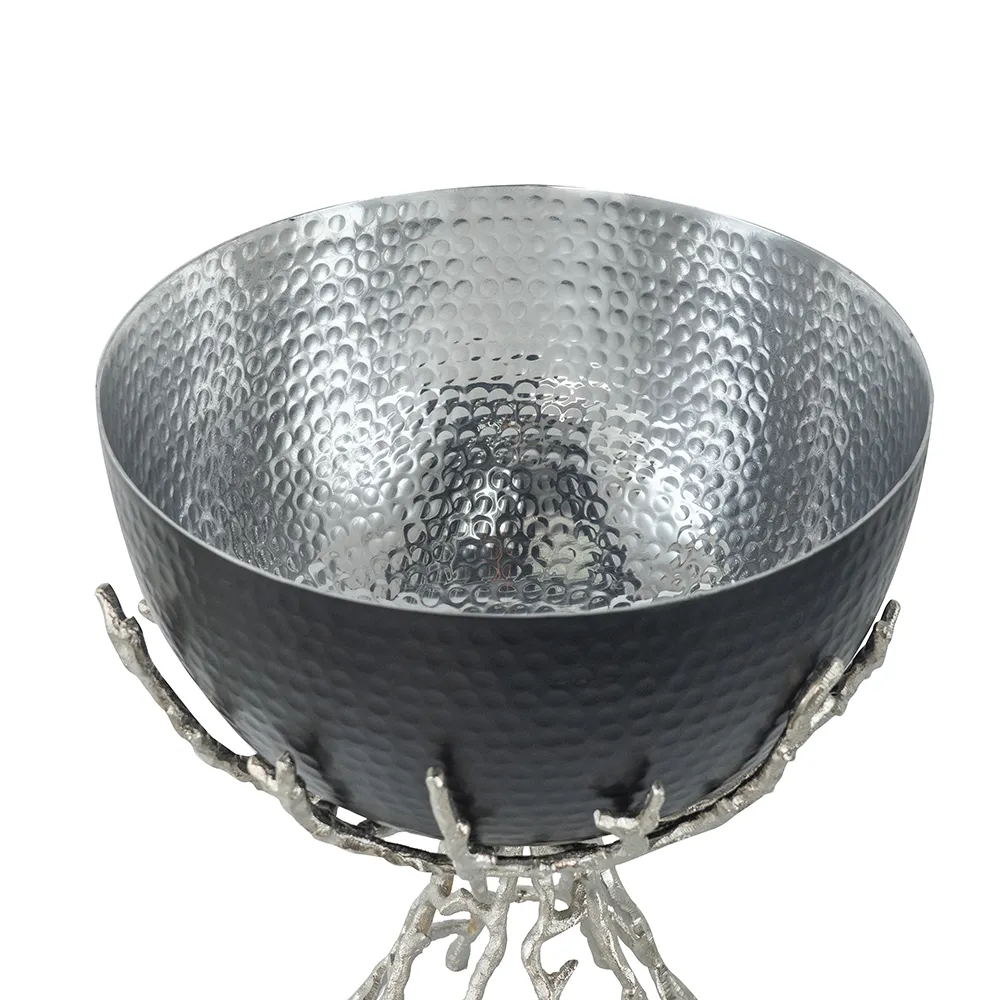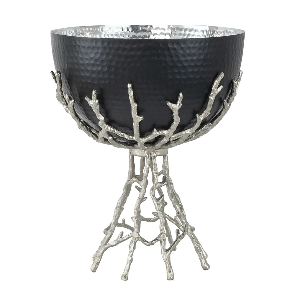 This chic modern large twig bowl in nickel and black encapsulates everything cool about Natural-inspired contemporary design. This stylish decorative metal bowl is made from aluminum with a round bowl that’s mounted on a stand of nickel finish twigs. It’s a showcase centerpiece with class for dining tables and kitchen islands.