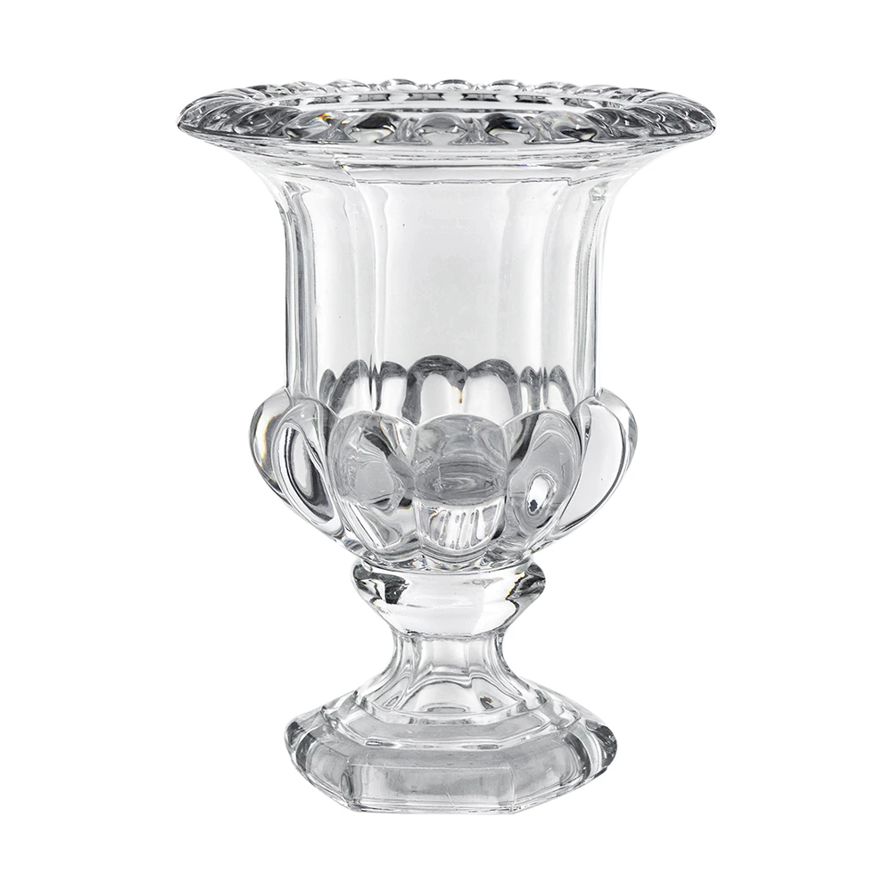 Drawing inspiration from vintage European glassware, this vase showcases a thick pedestal base, a crystal-clear finish, and ornate, petal-like detailing. Perfectly sized for greenery, lush florals, decorative stones, or seasonal ornaments, it brings timeless elegance and versatile charm to any space.