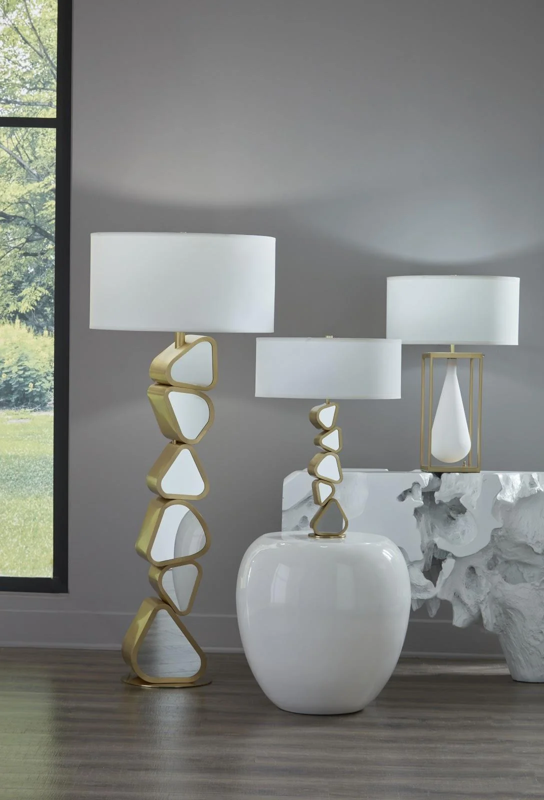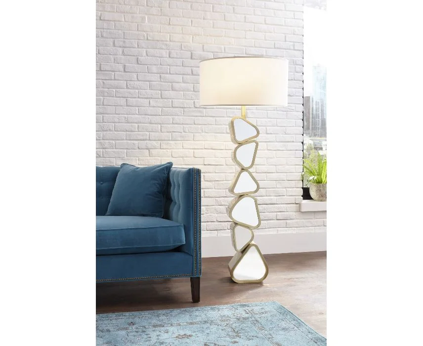 If we described the Pebble family of products as stacked stones, we?d give the wrong impression, as these furnishings are not made of rocks; they are created from long lengths of playful shapes that are reminiscent of river rocks in contour only. These are created when organically shaped pieces of mirror are encased in metal in a brushed brass finish, as is the case with the Pebble Floor Lamp.