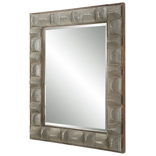 Inject rustic charm with a modern twist to your decor with our Pickford Gray Mirror. Designed with 3-dimensional scooped fir wood blocks, this mirror makes a dramatic statement. Sporting an aged gray wash and silver highlights for an elegant finish, the mirror offers distressed details on the naturally finished frame. Hang it horizontally or vertically to suit your style.