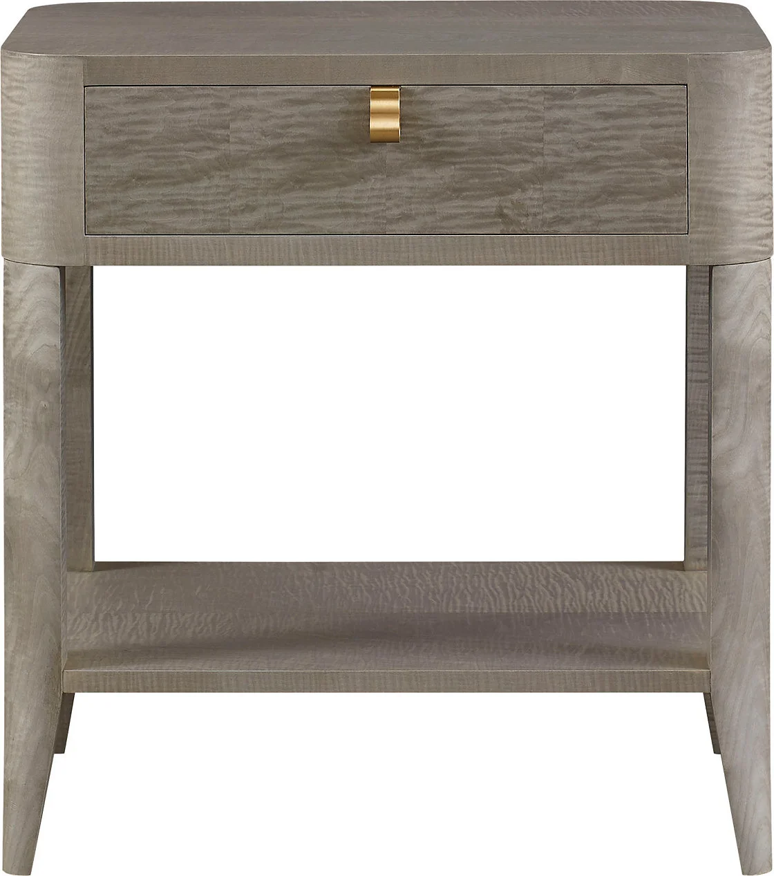 Featuring cast brass leather strap pulls and a figured English sycamore veneer, the Rosaline Nightstand harkens back to the age of luxury travel. Its design is inspired by the styling of stacked luggage trunks.