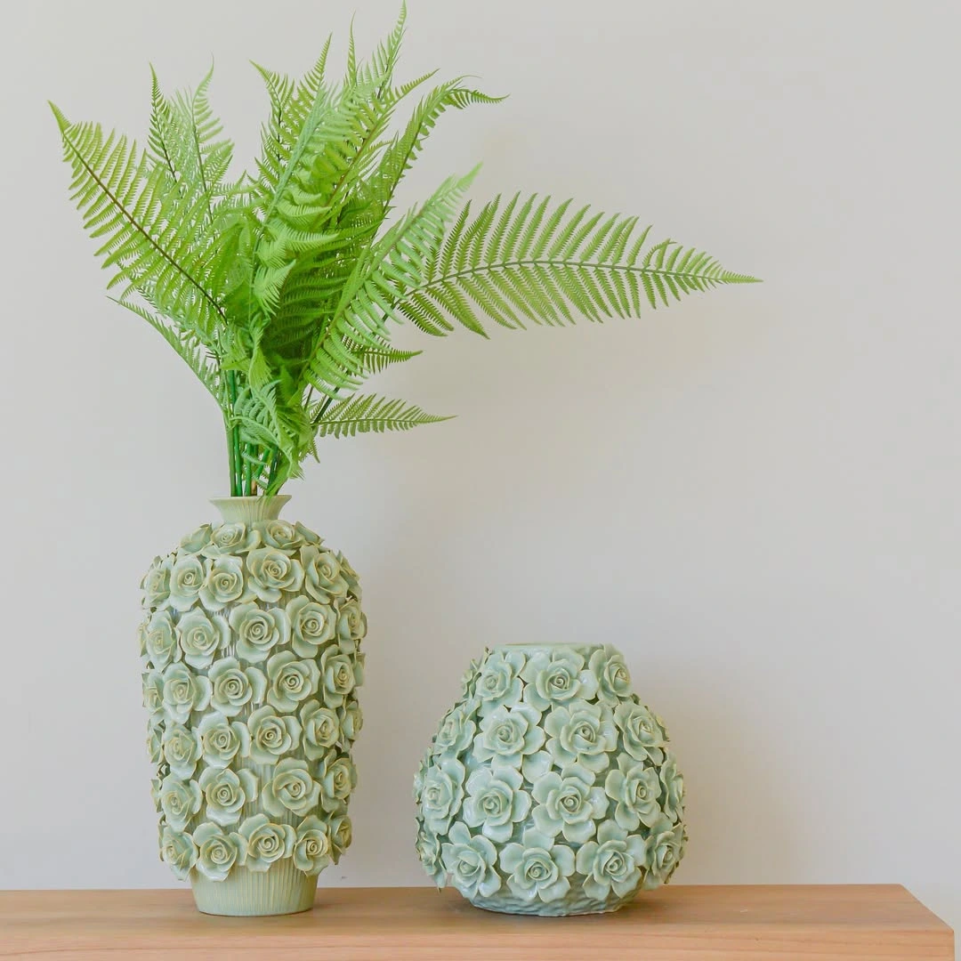 Handmade ceramic vase decorated with roses in a vintage soft green color.