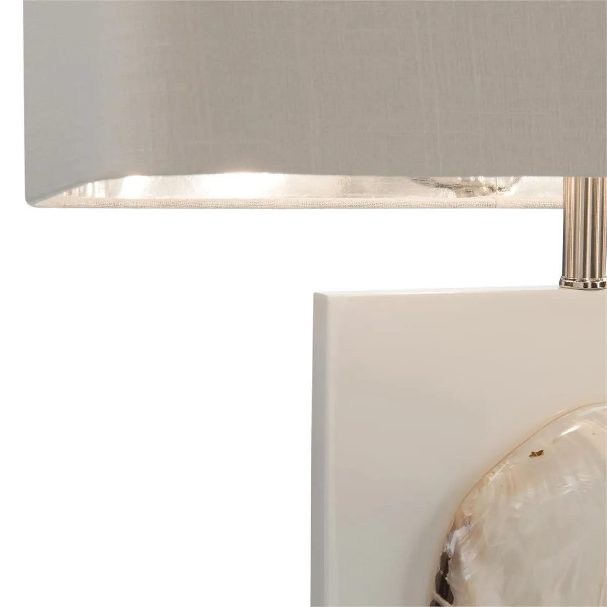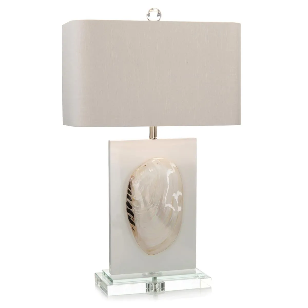 This table lamp is a must-have piece for a beachy abode. It is designed with an acrylic panel inlaid with a glossy natural seashell. It is finished with Polished Nickel hardware and a tiered acrylic pedestal base.