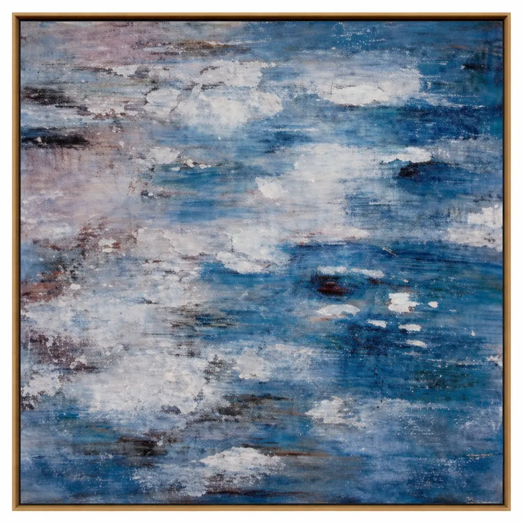 A contemporary abstract composition blending soft whites and layered blue tones, evoking the calm movement of water and sky. Enhanced with rich texture and depth, the artwork is elegantly finished with a light bronze wooden frame, adding warmth and sophistication to any modern interior
