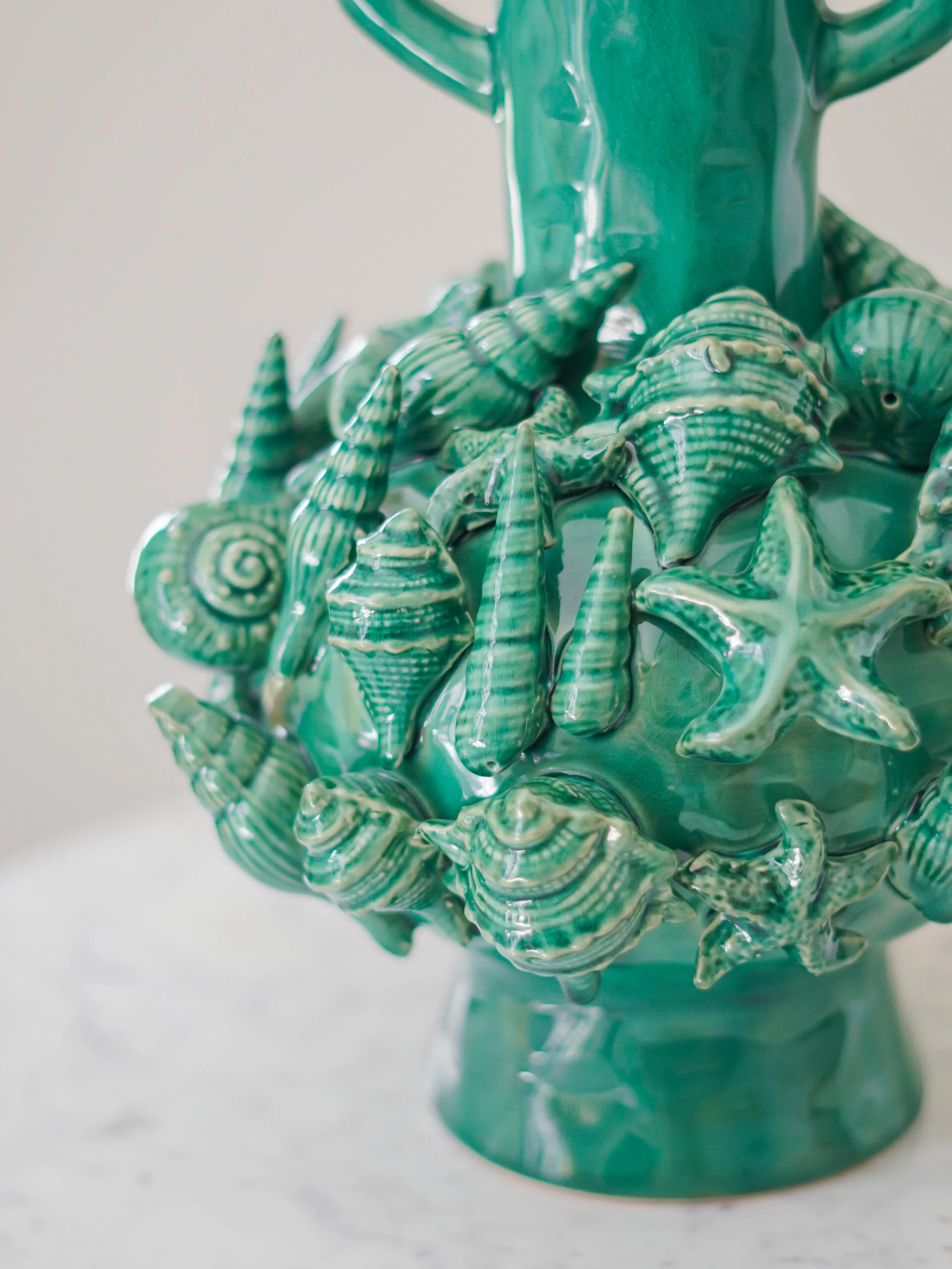Tall handmade ceramic goblet vase with shells and starfish in ocean blue