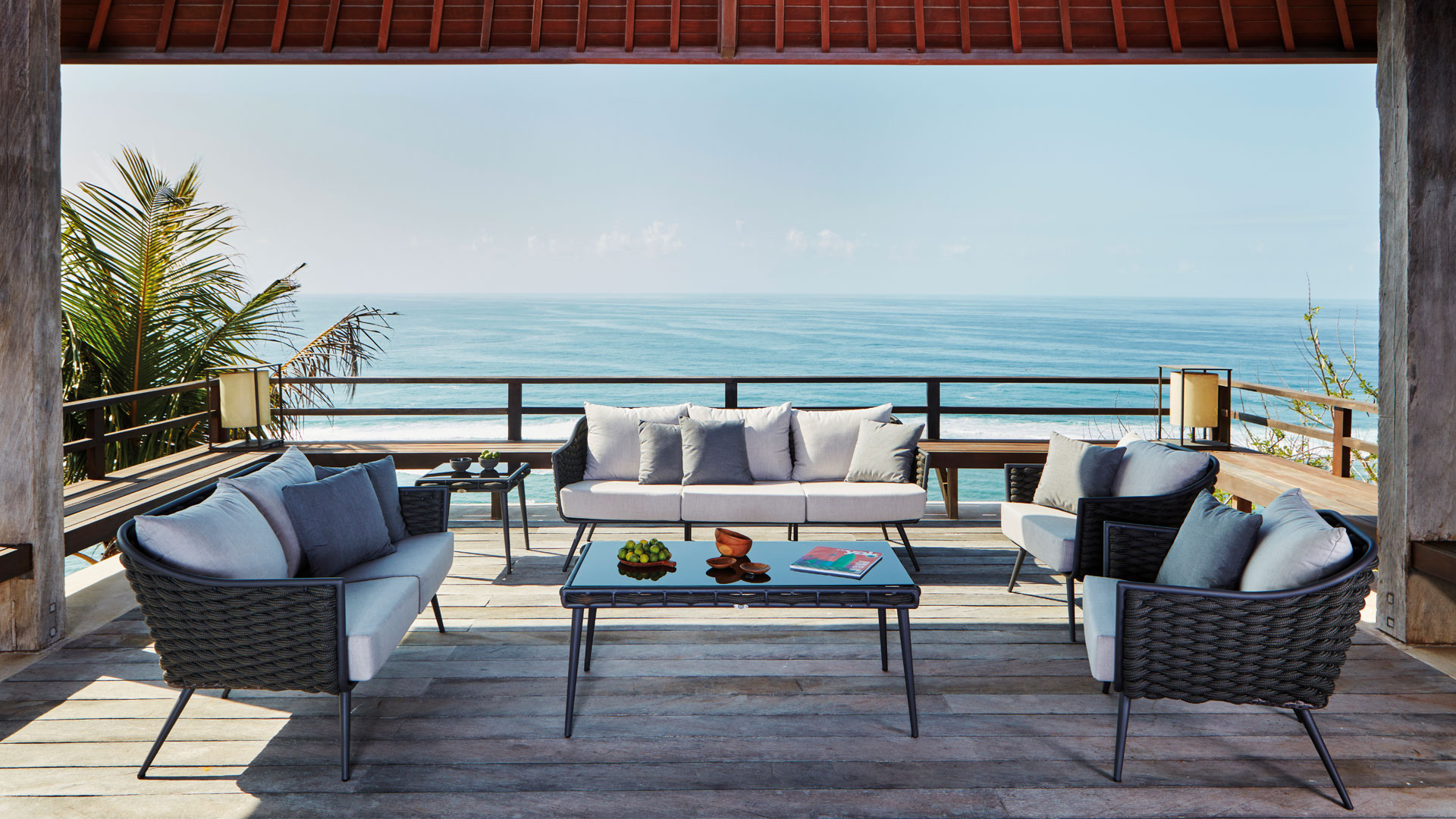 The carbon matt finish with a composite aluminum table top fits effortlessly into any contemporary terrace, patio, or poolside space and comfortably seats up to eight guests. Made using only the highest quality performance materials, the Serpent Living Set is also resistant to a wide range of temperatures, as well as salt and chlorine, for both durability and practicality.