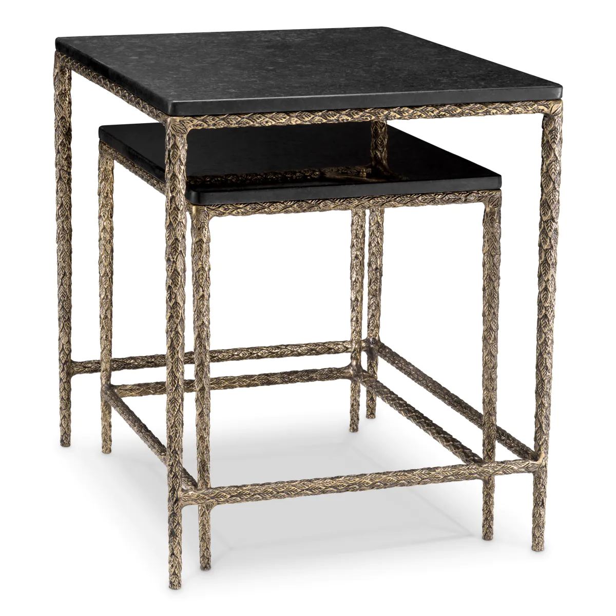 These two artisan-crafted pieces boast square-shaped tops of luxurious black granite, each set upon a vintage brass-finished base. With differing heights for dynamic appeal, these tables offer versatile elegance as standalone pieces or a harmonious pair.