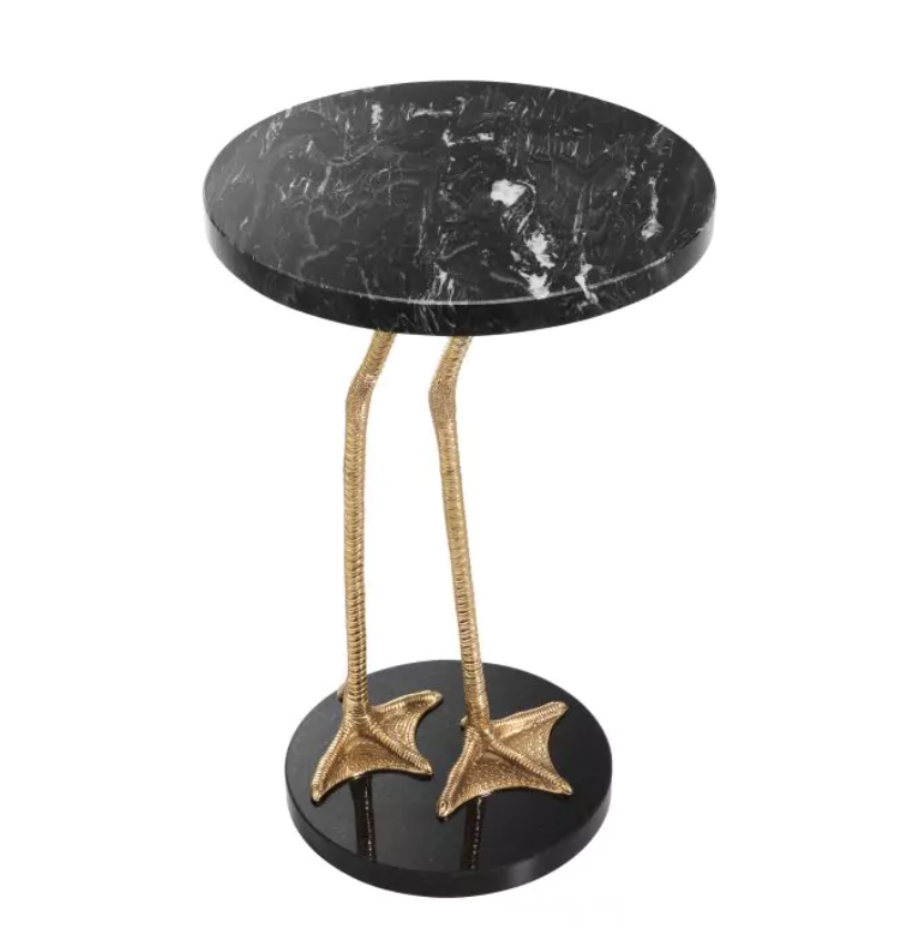 With flamingo leg-inspired footing in polished brass, the Lagoon Side Table is a unique addition to your living space. Featuring a round black marble top and black granite base it serves as an exquisite accent table or even nightstand!