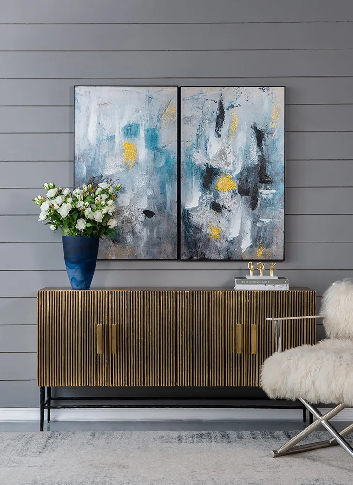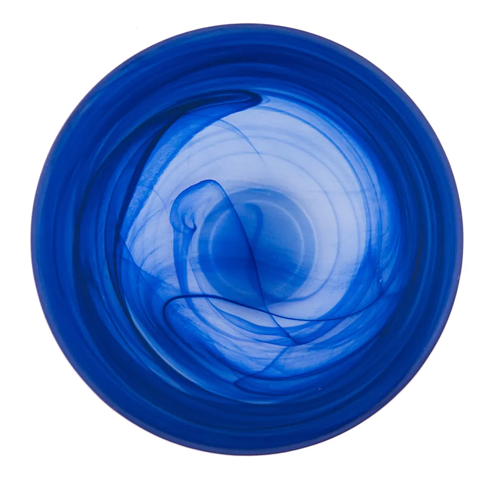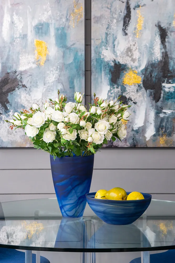 This Smokey Blue Glass Vase is a great addition to your design. Finished off with your favorite florals on a bedside table or at your entry way. The smokey blue swirls add a modern look to a classic style.