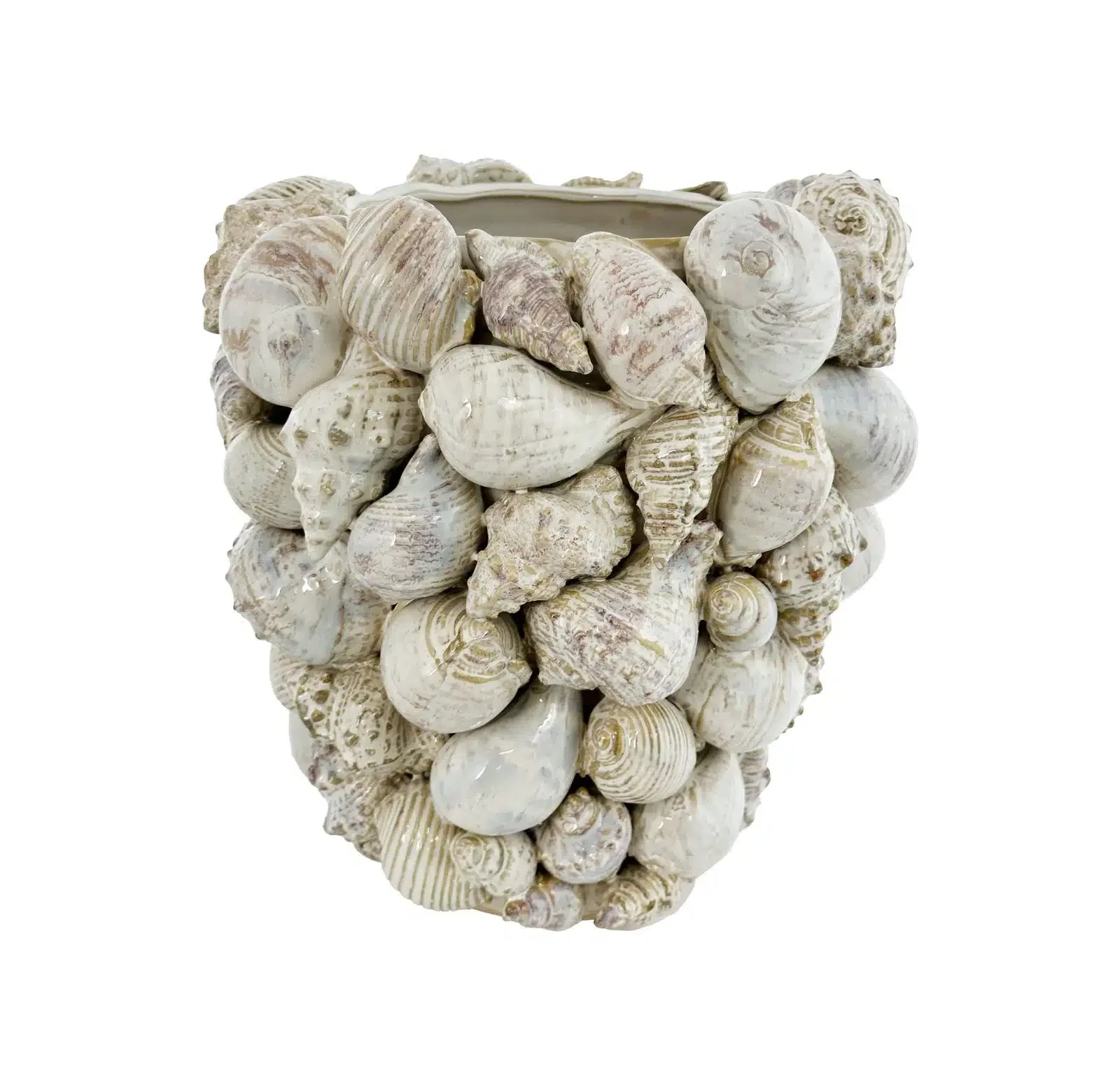 Handmade ceramic vase, decorated with mixed shells in a warm creamy tone.