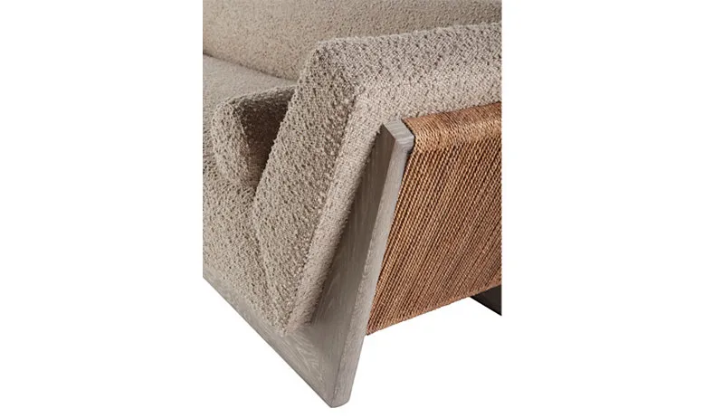 White oak framed sofa with abaca rope strand accent. Tight segmented seat and back. (2) 6″ x 22″ Bolster pillows standard.