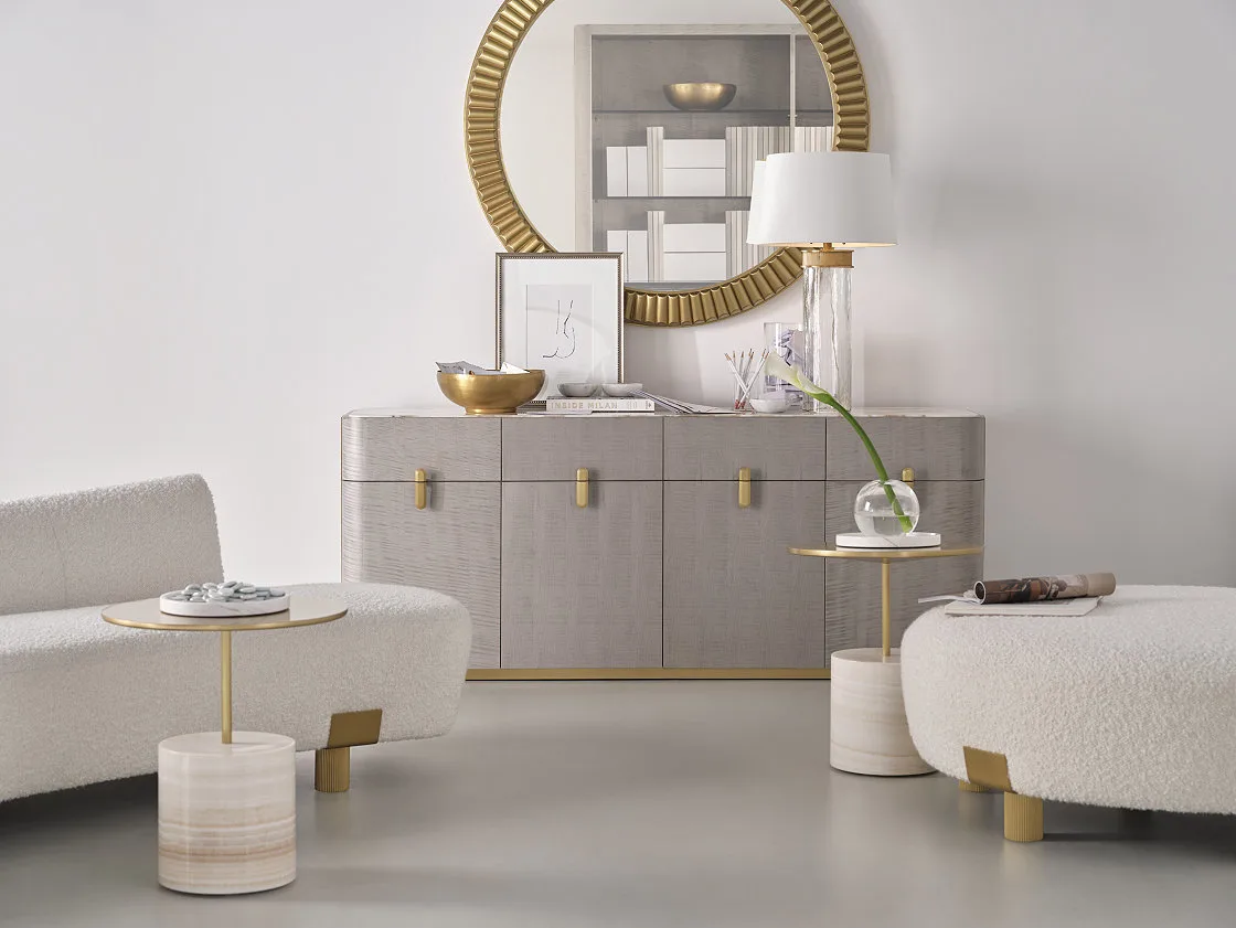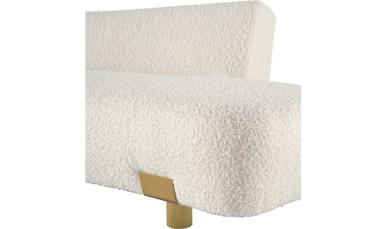 The Strap Sofa is designed to float in space and provide alluring views from all angles. The sofa’s bronze strap details and sculptural look give the piece a clean and modern edge.