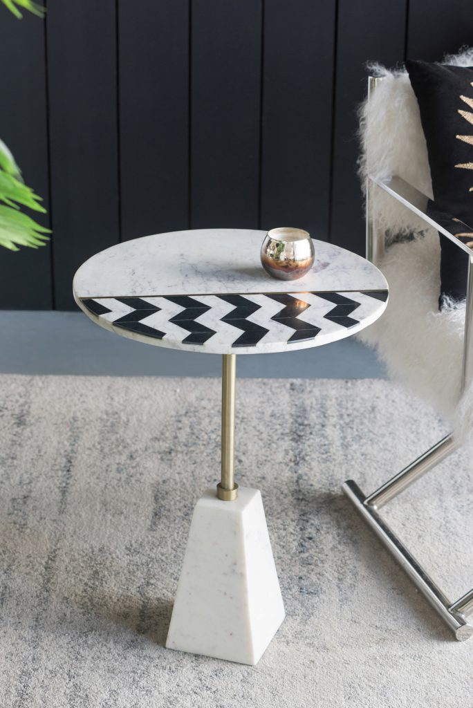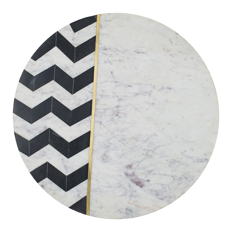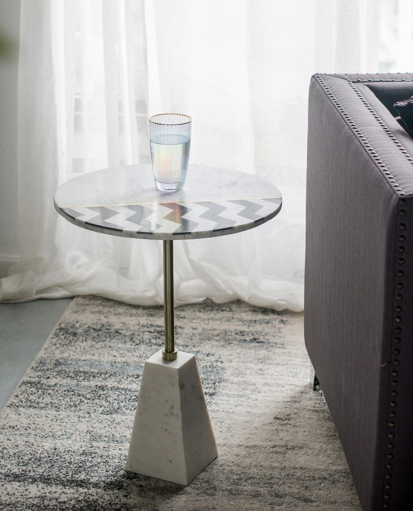 A tapered pedestal base made of marble is completed with a round top with a brass inlay and pattern. Full of modern simplicity in its low profile and design elements, its a versatile table that can be used anywhere in the house. Place it in the living room to instantly elevate the ambiance and the style of your furnishings and decor.