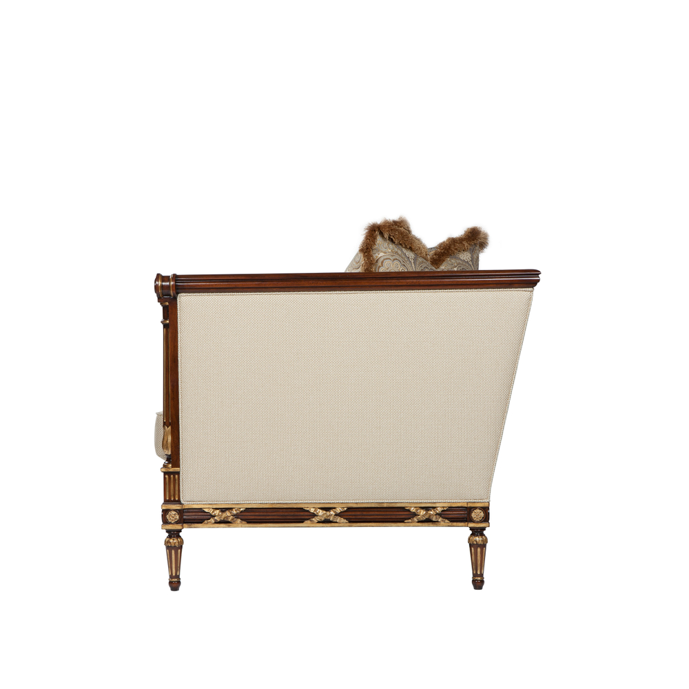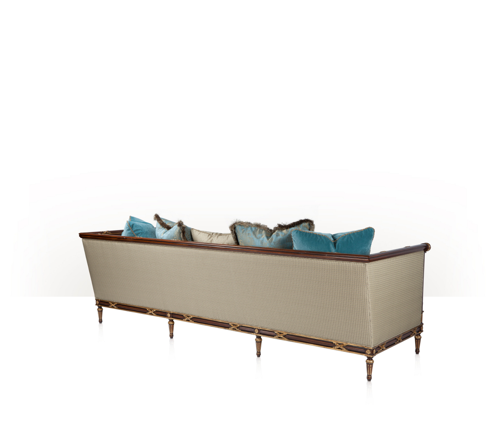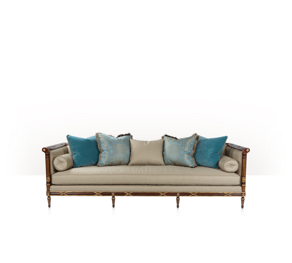 A hand-carved and parcel gilt great sofa, the bound reed carved top rail with high arms, with fluted column and lapette carved uprights, the bench cushion seat and tight back with two bolsters and five throw pillows standard on a bound reed carved and flowerhead seat rail with acanthus carved and fluted tapering legs.