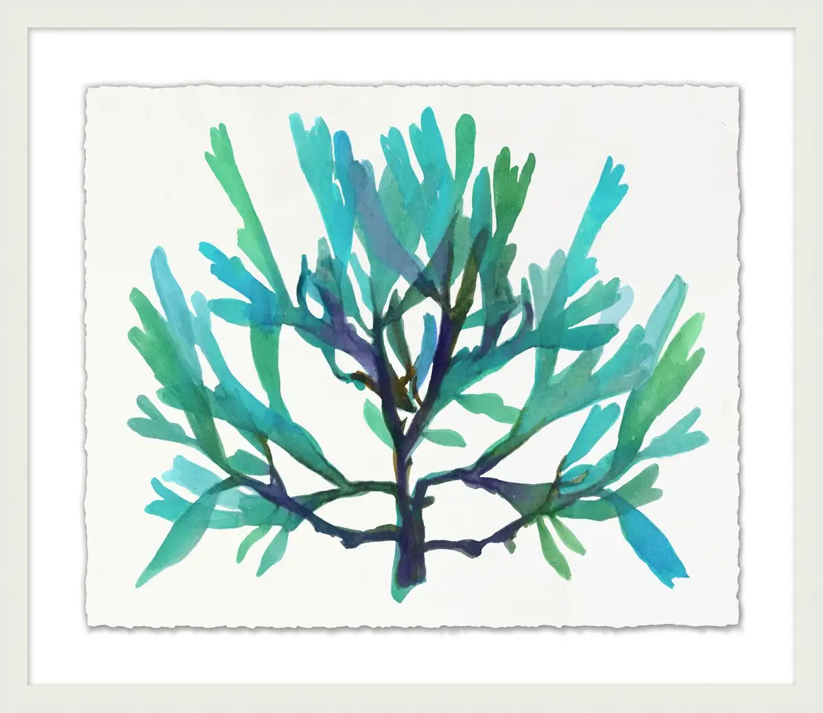 Watercolor artwork inspired by organic coral forms, blending soft turquoise, teal, and deep ocean tones to create a calm, fluid composition. The delicate brushwork evokes natural underwater movement, adding a fresh and contemporary coastal feel.