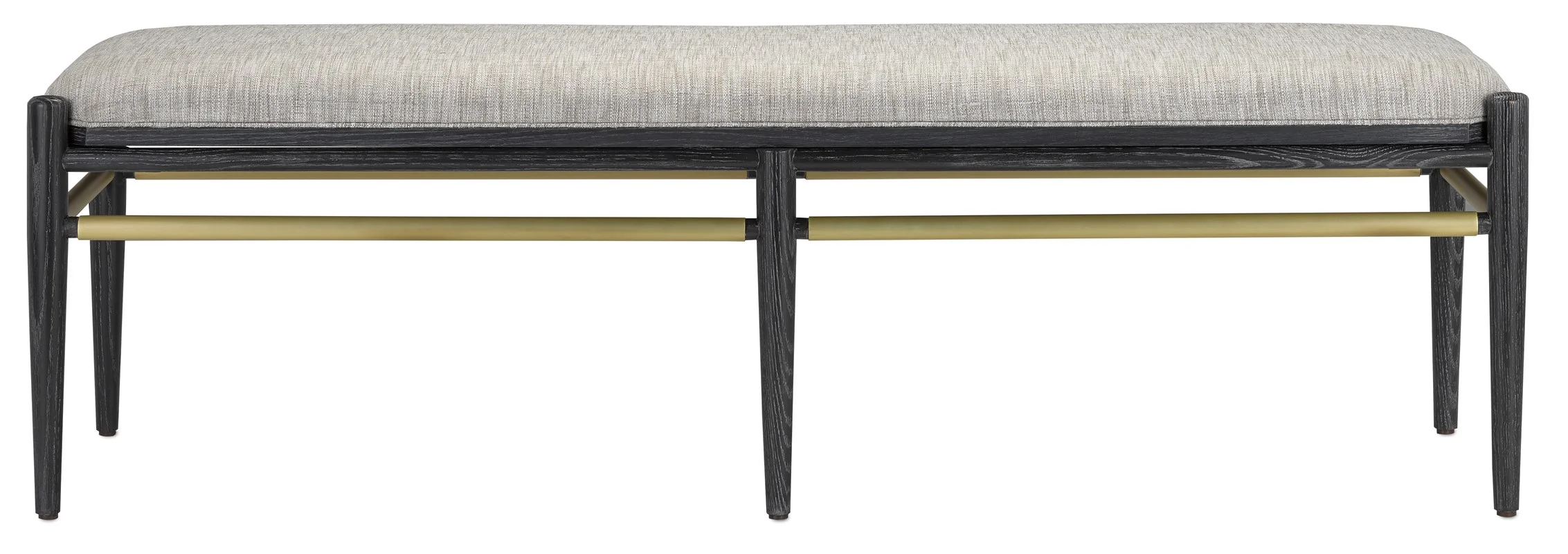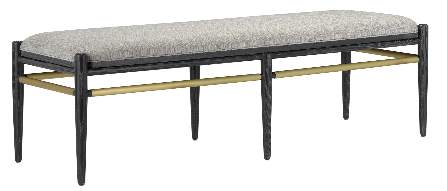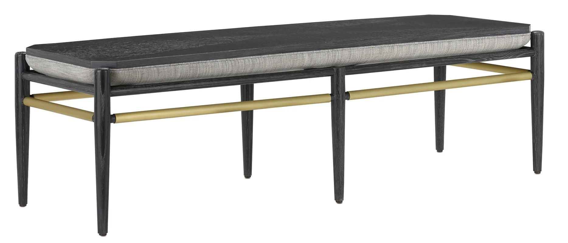 The Visby Smoke Black Bench is made of solid oak in a cerused black finish with a linear brass accent in a brushed brass finish. The mid-century lines are enhanced by the rough ceruse treatment on the wood. The seat cushion of the black bench is shown here upholstered in a F0224 Arita Smoke fabric. It is reversible so that the Visby can be used either as a seat or a table.